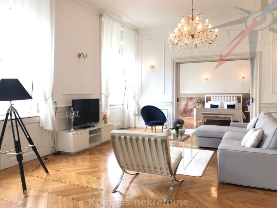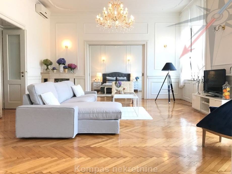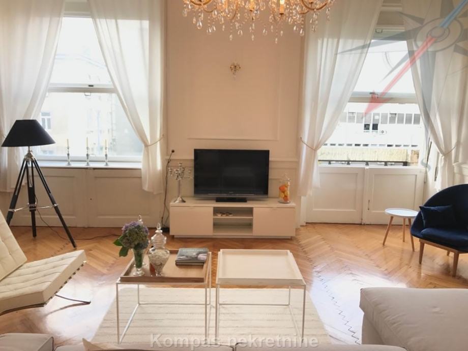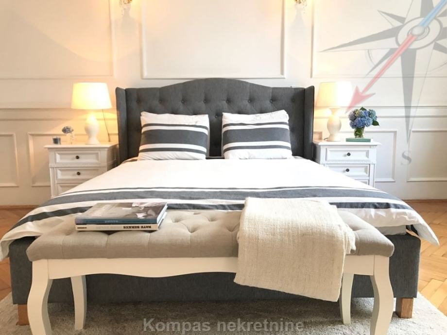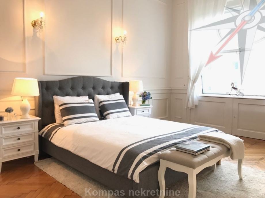 Furnished three room apartment (130 m2) on the second floor of a residential building with an elevator, Ulica kralja Držislava. The apartment is completely renovated and has new installations for water, gas, electricity and sewage. It consists of a kitchen, living room, two bedrooms, two bathrooms, large hallway with closet, balcony. Has security door, intercom, optical internet, air conditioning, gas central heating, high ceilings .A possibility of parking in the yard of the building. The apartment is located near public transport and all amenities of the strict city center.