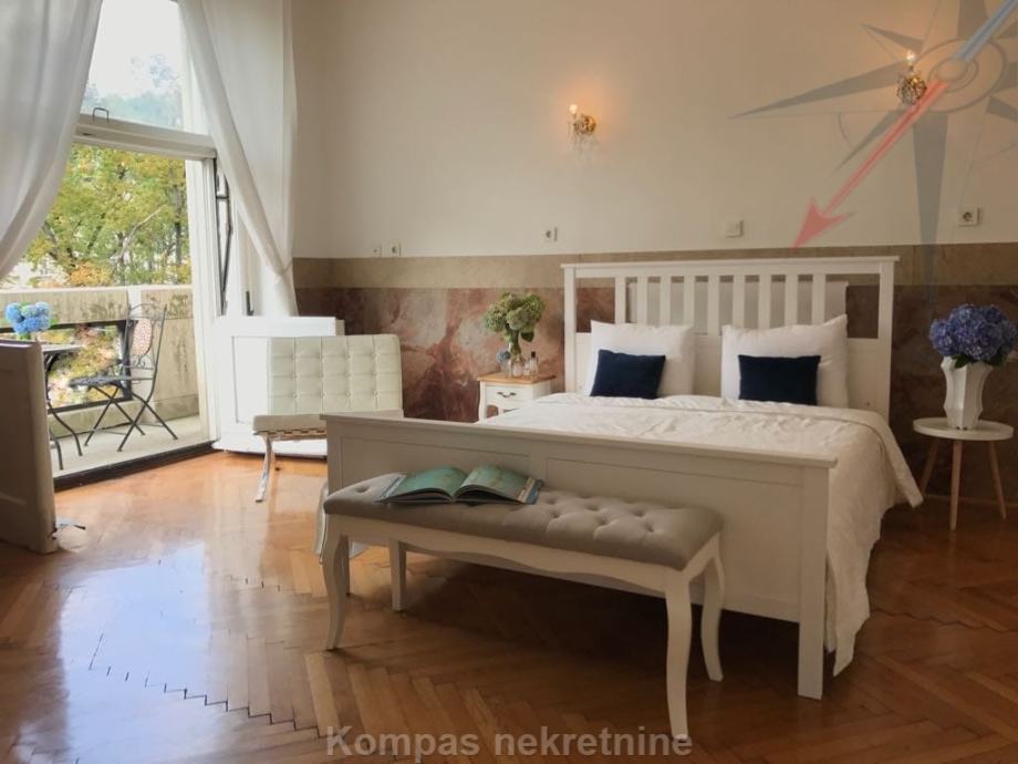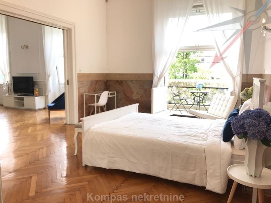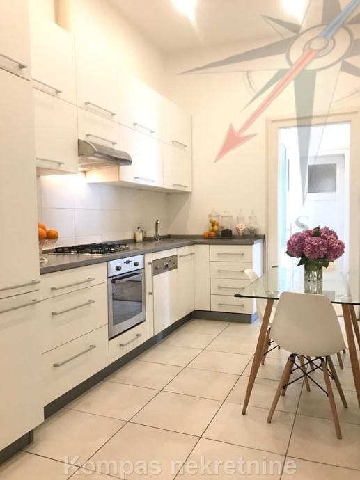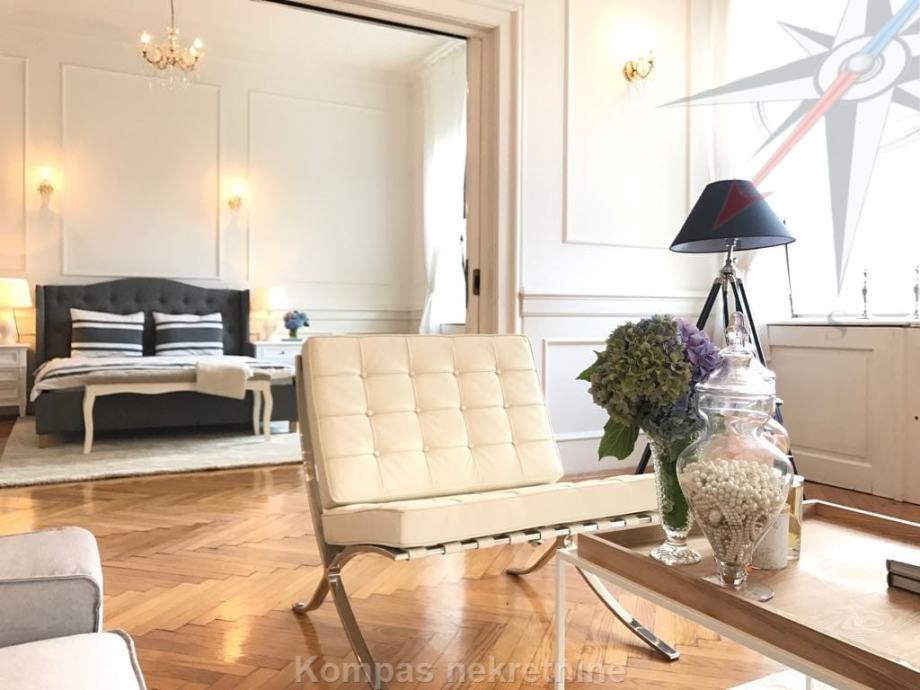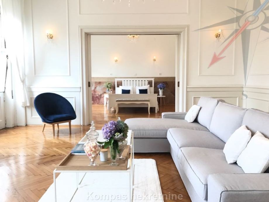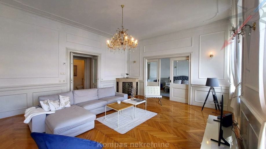 Furnished three room apartment (130 m2) on the second floor of a residential building with an elevator, Ulica kralja Držislava. The apartment is completely renovated and has new installations for water, gas, electricity and sewage. It consists of a kitchen, living room, two bedrooms, two bathrooms, large hallway with closet, balcony. Has security door, intercom, optical internet, air conditioning, gas central heating, high ceilings .A possibility of parking in the yard of the building. The apartment is located near public transport and all amenities of the strict city center.