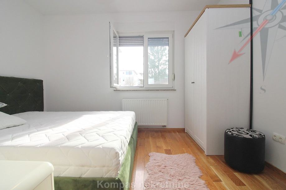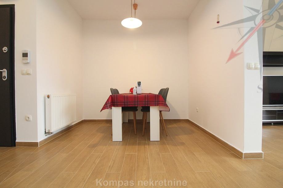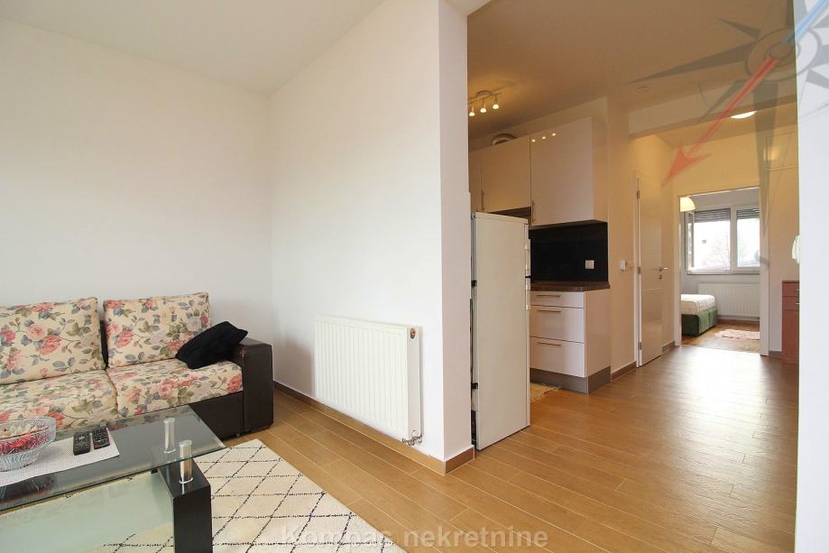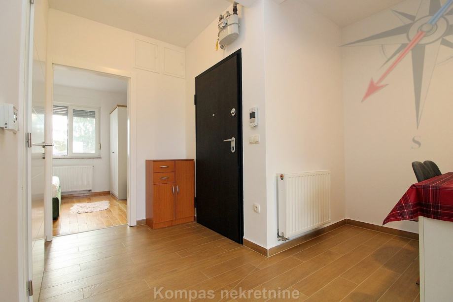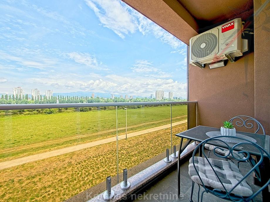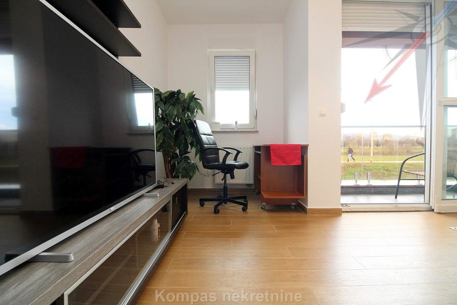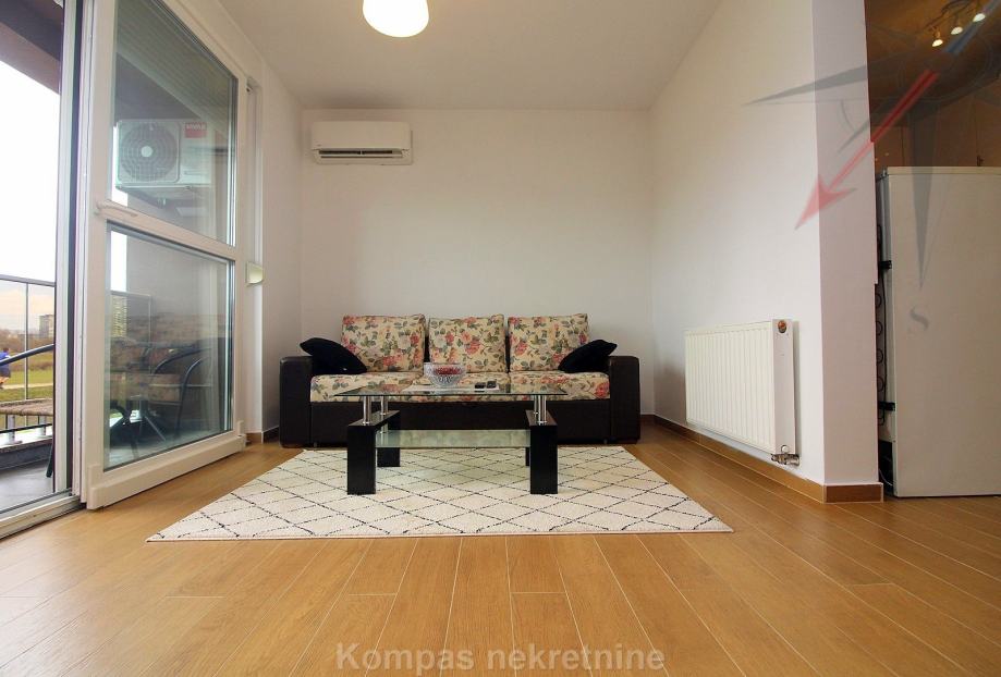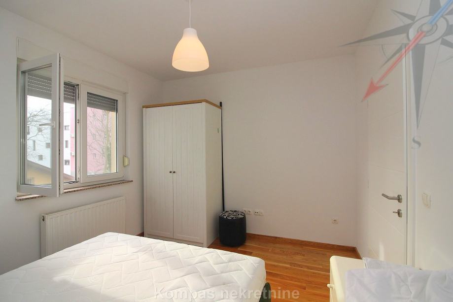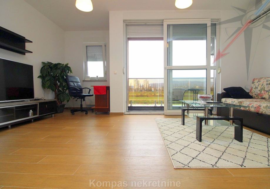 Furnished two-room apartment (50 m2), on the first floor of a small new building without an elevator, Radoslava Cimermana Street. It consists of a kitchen, living room, bedroom, bathroom, loggia. It has a security door, air conditioning, high-speed internet, gas heating, underfloor heating. All meters are separate. The overhead costs are around 40 euros in the summer, higher in the winter depending on gas consumption. It comes with one parking space in the building's parking lot, which is protected by a remote-controlled ramp. The apartment is located near Lake Bundek, shopping centers, public transportation and major city roads.