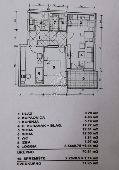 Raspored stana obuhvaća ulazni prostor kao središnju komunikacijsku zonu, kupaonicu, odvojeni WC, kuhinju povezanu s dnevnim boravkom i blagovaonicom, dvije spavaće sobe te izbu. Dnevni boravak i jedna spavaća soba imaju izlaz na loggiu, koja zahvaljujući položaju stana na višem katu pruža privatnost i ugodan prostor za boravak.