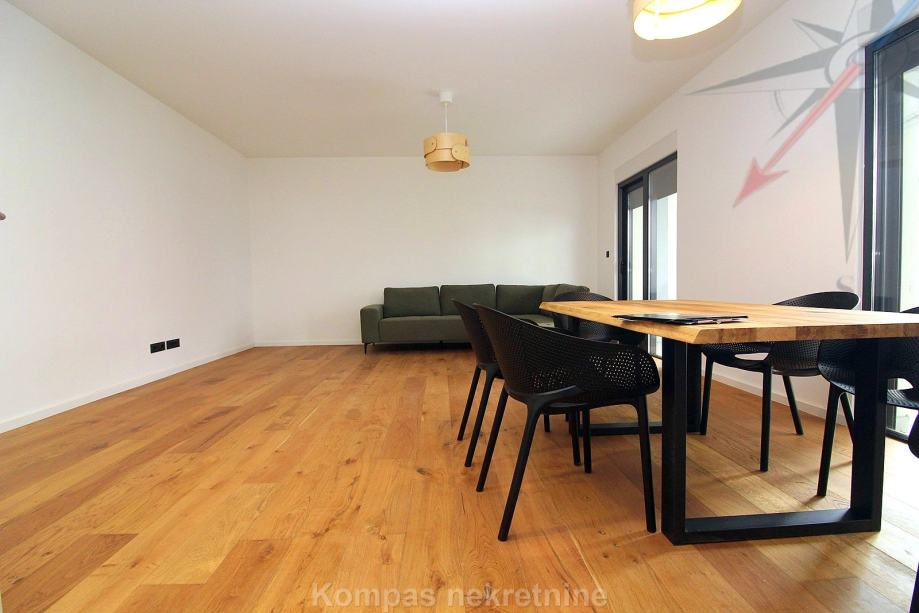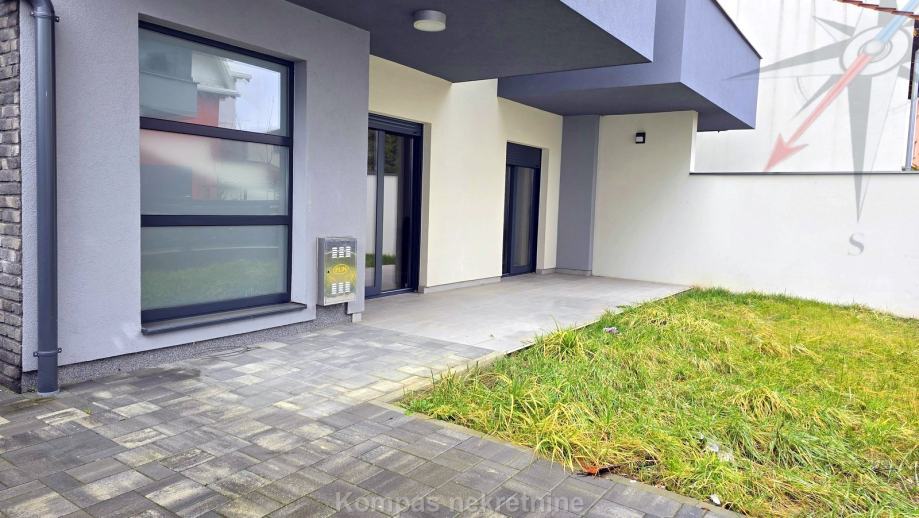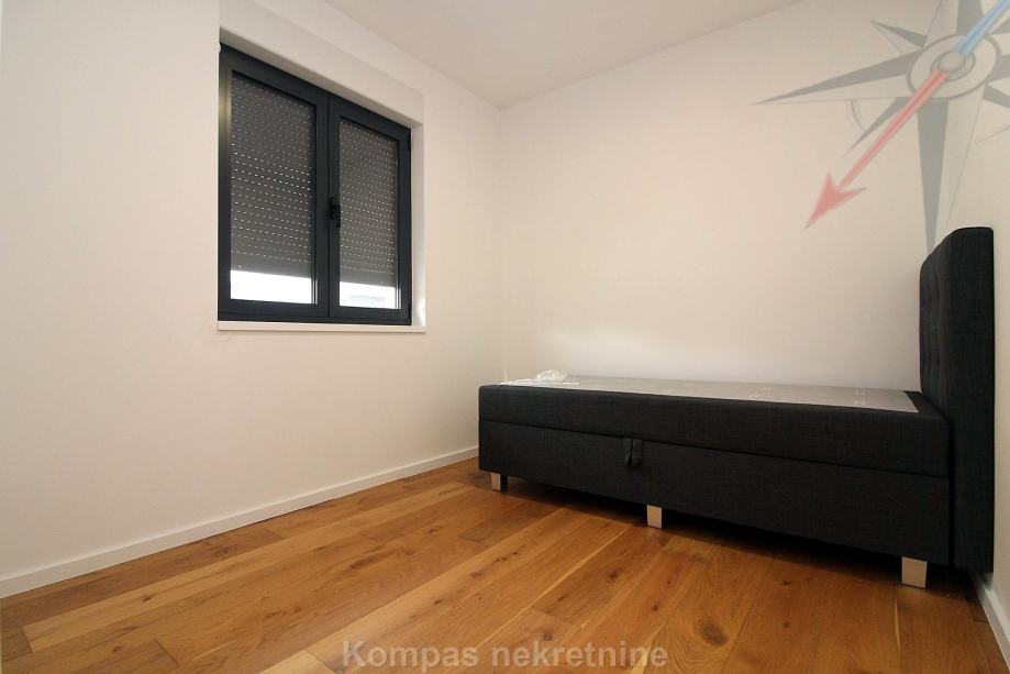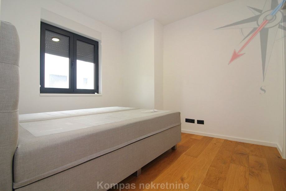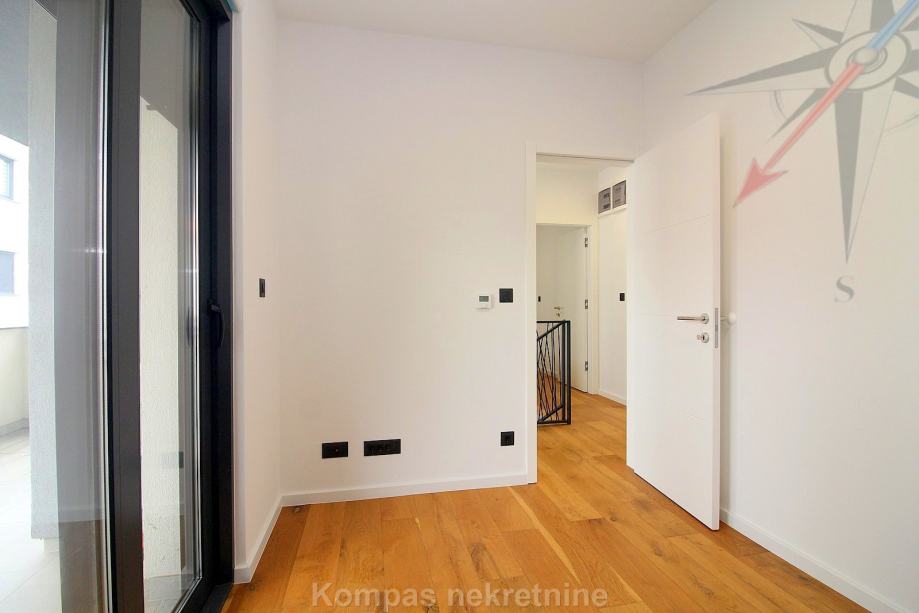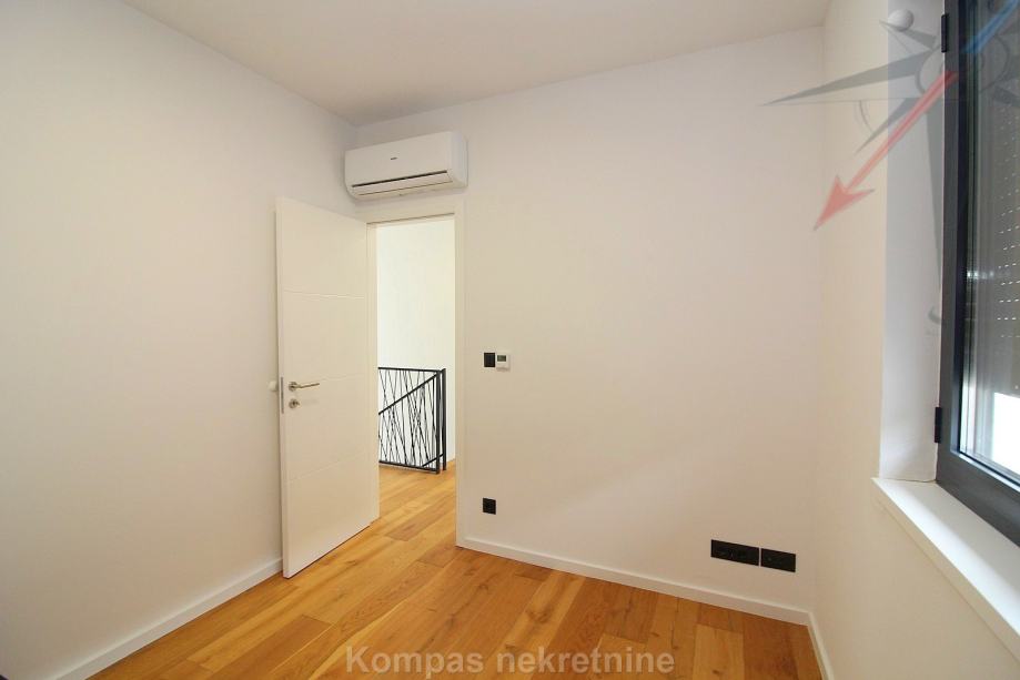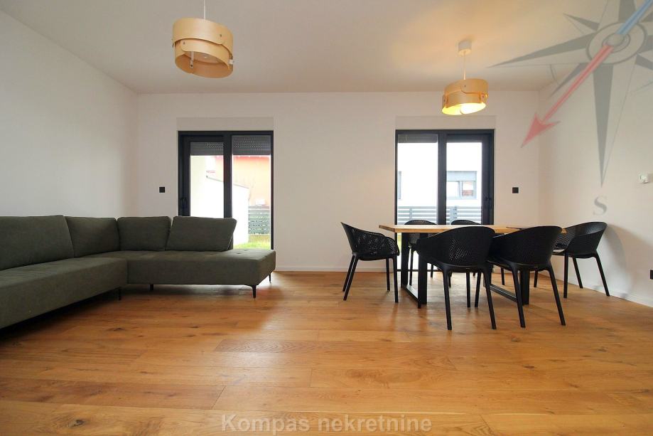 Novi moderno namješten 4-soban stan na tri etaže ( 110 m2 ) nove stambene zgrade s vlastitim vrtom, Jablanska ulica. Sastoji se od ulaznog prostora, kuhinje, dnevnog boravka, tri spavaće sobe, garderobe, balkona, kupaonice, toaleta, dvorišta. Ima protuprovalna vrata, portafon, aluminijsku stolariju, električne rolete, podno grijanje. Svi aparati i namještaj novi su i pod garancijom, klimatizacija je u svim prostorijama. Pripadaju mu dva parkirna mjesta u dvorištu zgrade. Nalazi se u blizini javnog prijevoza i trgovačkih centara, s puno sadržaja u samom naselju.