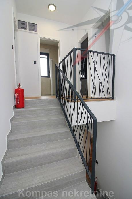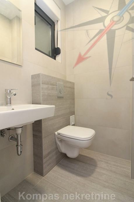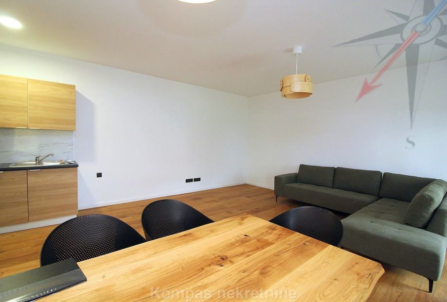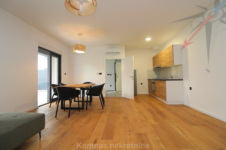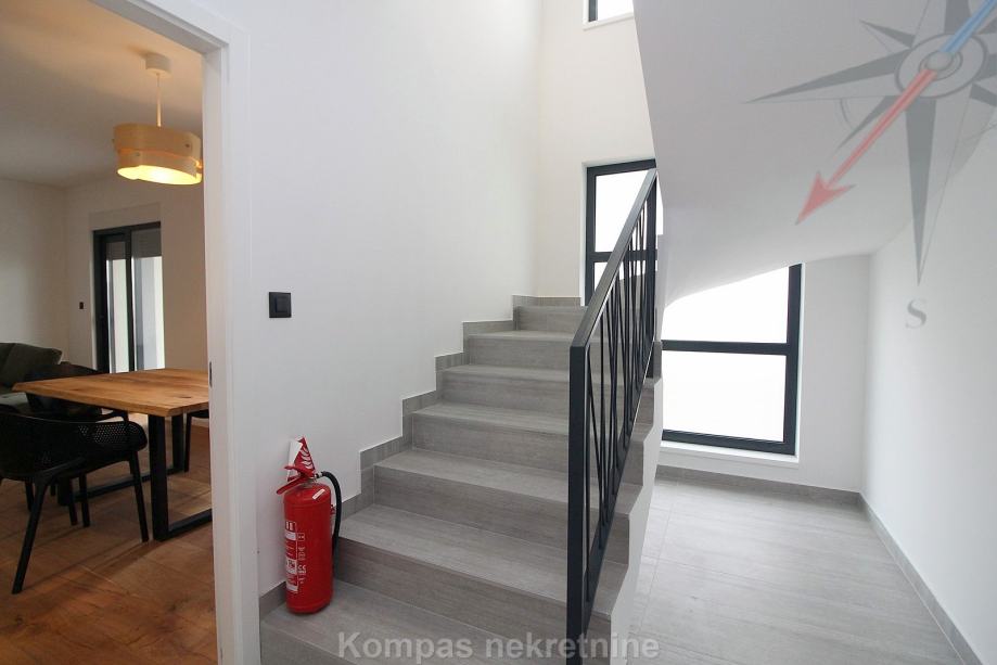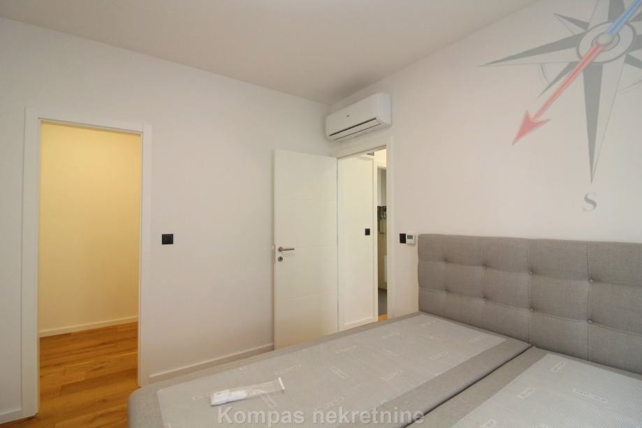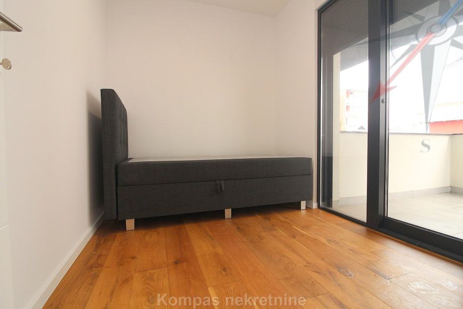 Novi moderno namješten 4-soban stan na tri etaže ( 110 m2 ) nove stambene zgrade s vlastitim vrtom, Jablanska ulica. Sastoji se od ulaznog prostora, kuhinje, dnevnog boravka, tri spavaće sobe, garderobe, balkona, kupaonice, toaleta, dvorišta. Ima protuprovalna vrata, portafon, aluminijsku stolariju, električne rolete, podno grijanje. Svi aparati i namještaj novi su i pod garancijom, klimatizacija je u svim prostorijama. Pripadaju mu dva parkirna mjesta u dvorištu zgrade. Nalazi se u blizini javnog prijevoza i trgovačkih centara, s puno sadržaja u samom naselju.
