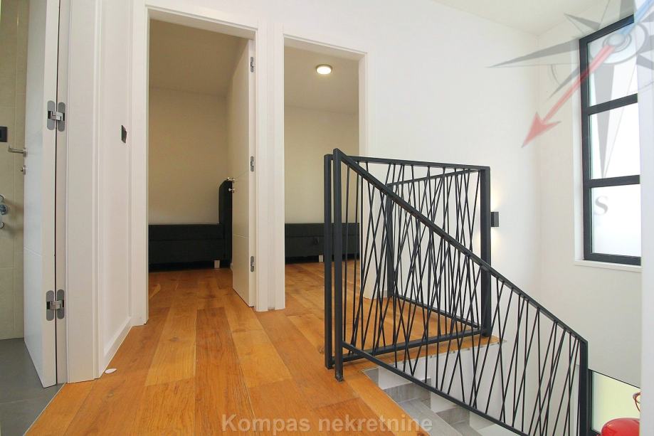New, modern furnished 4-room apartment on three floors (110 m2) of a new residential building with its own garden, Jablanska street. It consists of an entrance area, kitchen, living room, three bedrooms, balcony, bathroom, toilet, yard. It has security door, intercom, aluminum joinery, electric shutters, underfloor heating, air conditioning in all rooms . All appliances and furniture are new and under warranty. It has two parking spaces in the courtyard of the building. Located near public transport and shopping centers, with a lot of facilities in the settlement itself.