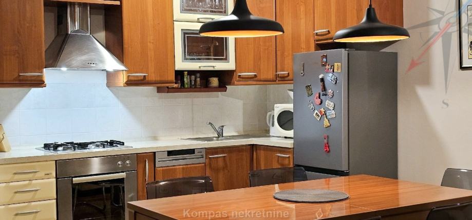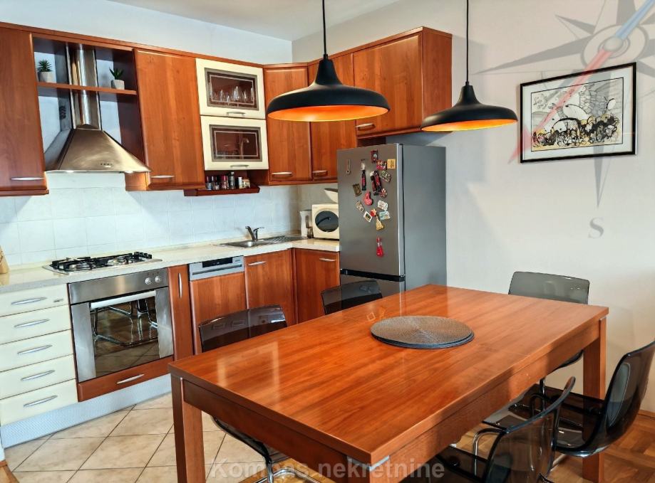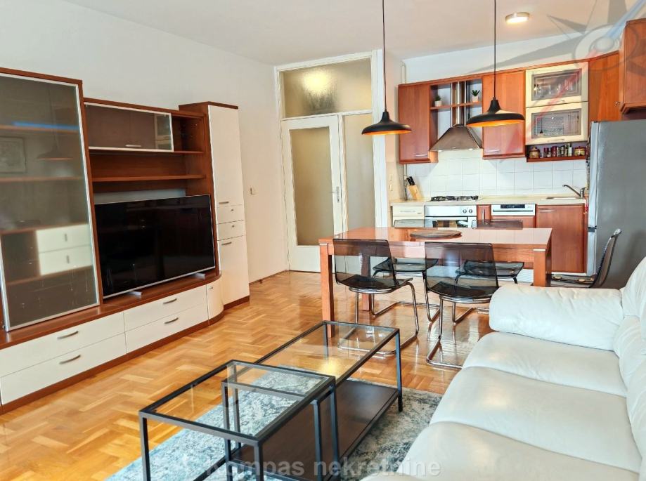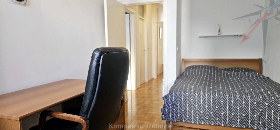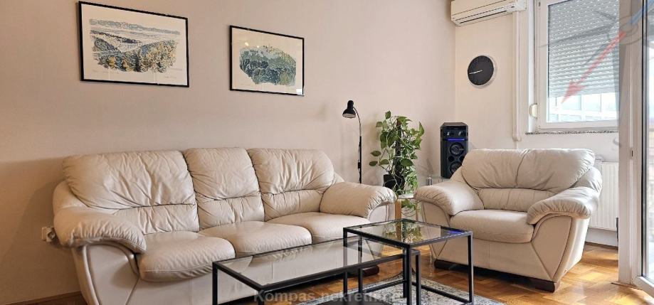 Furnished three-room apartment (75 m2) on the second floor of a residential building with an elevator, Bobovačka Street. Consists of a hallway, storage room, kitchen, living room with access to a loggia, two bedrooms, bathroom and toilet. It has a security door, gas central heating, air conditioning and the possibility of high-speed internet. Pets are not allowed. The apartment has one outdoor parking space. The building has access for people with disabilities. It is located near public transport, schools and Trešnjevka Market.