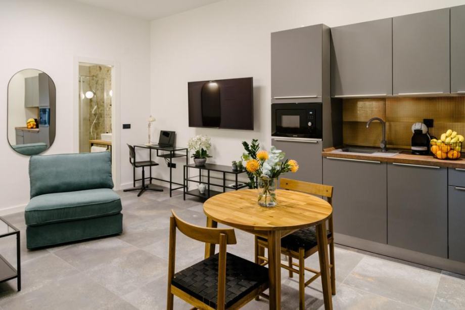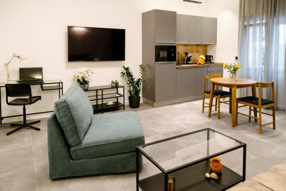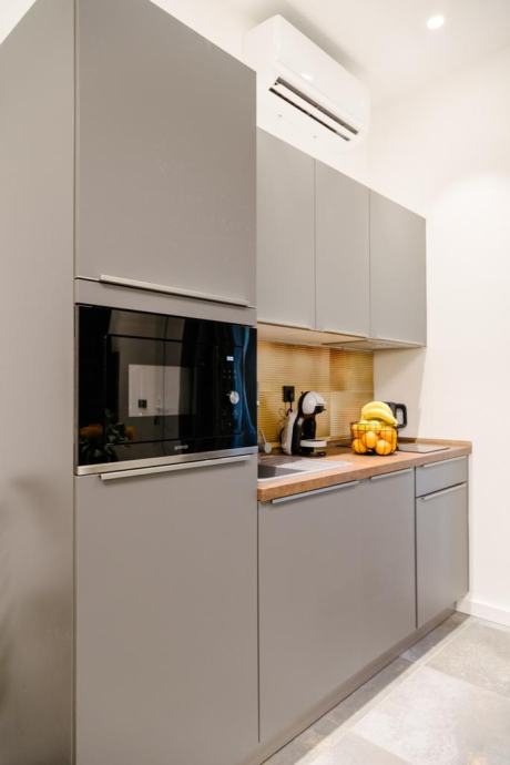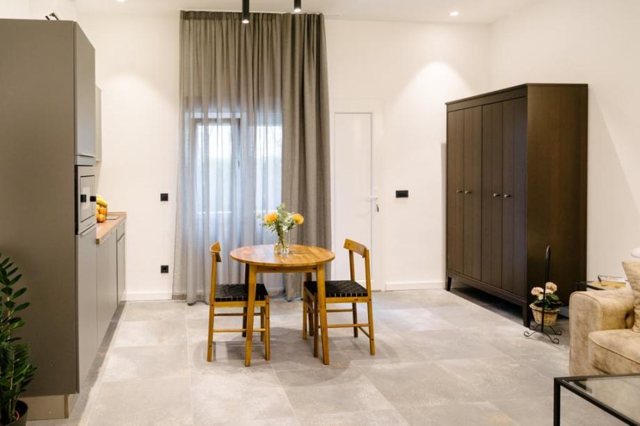 Ima 30m2, sastoji se od dnevnog boravka/spavaćeg dijela, kuhinje s blagavaonom i kupatilom.
