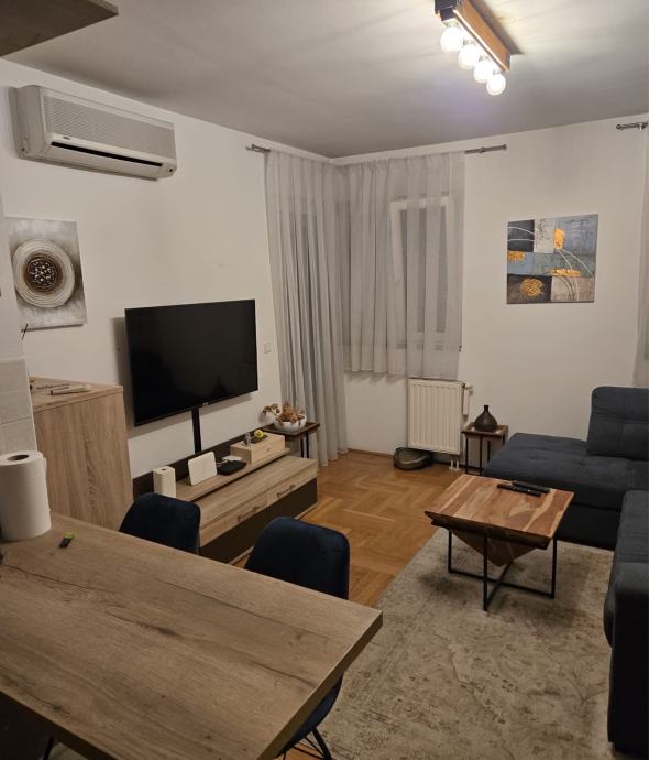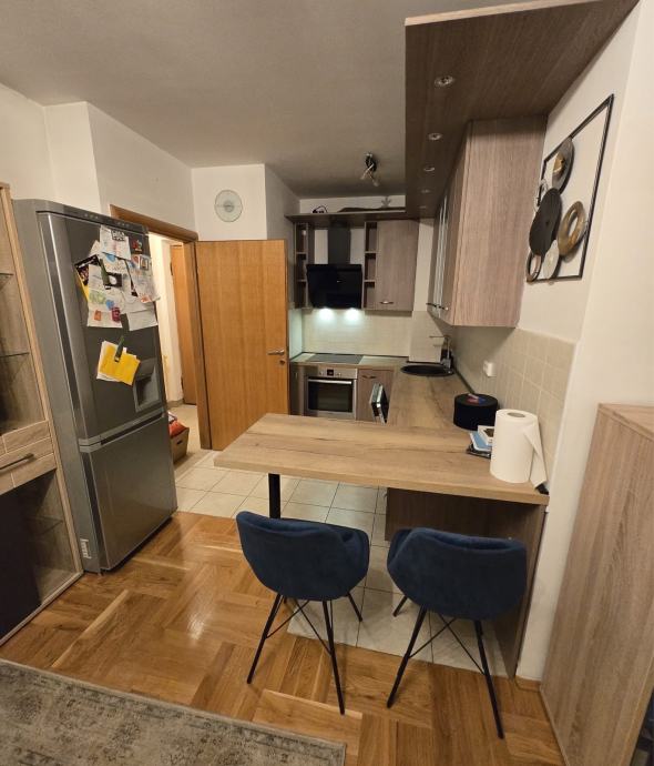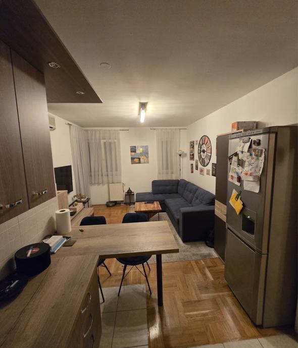 Dvosoban stan od 40 m² na prvom katu trokatnice s liftom u Dugavama, u istočnom dijelu Novog Zagreba. Stan je jednoetažan i potpuno namješten - dnevni boravak opremljen je kaučem, TV-om i stolom za blagovanje, a prostorija je otvorena prema kuhinji što daje osjećaj kontinuiranog prostora. Parket u dnevnom dijelu, keramika u kuhinji.