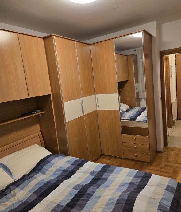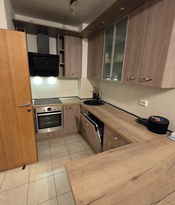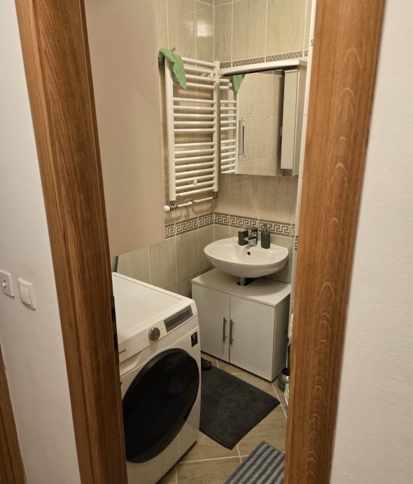 Kuhinja je odvojena kuhinjskim pultom i dobro opremljena - ugradbena ploča, pećnica, napa, hladnjak i perilica posuđa vidljivi su na fotografijama. Kupaonica s WC-om je jedna.Perlica i susilica.Stan ima lođu i klimatiziran je zidnom jedinicom. Grijanje je priključeno na gradsku toplanu.