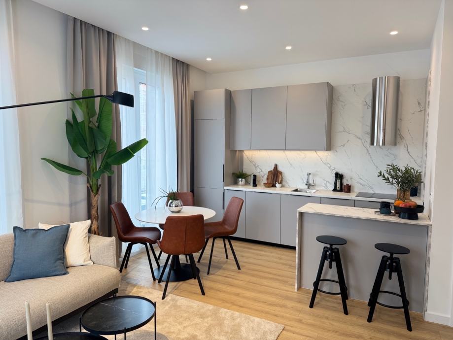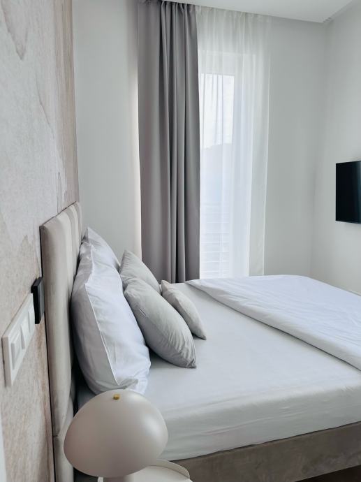 Iznajmljuje se dizajnerski uređeni trosoban penthouse stan, pun svjetlosti na odličnoj lokaciji, sa visokim stropovima 3m. Stan se sastoji od dnevnog boravka sa kuhinjom i blagovaonicom, dvije spavaće sobe i 1 kupaone. Grijanje u čitavom stanu je podno na toplotnu dizalicu i stan je klimatiziran.