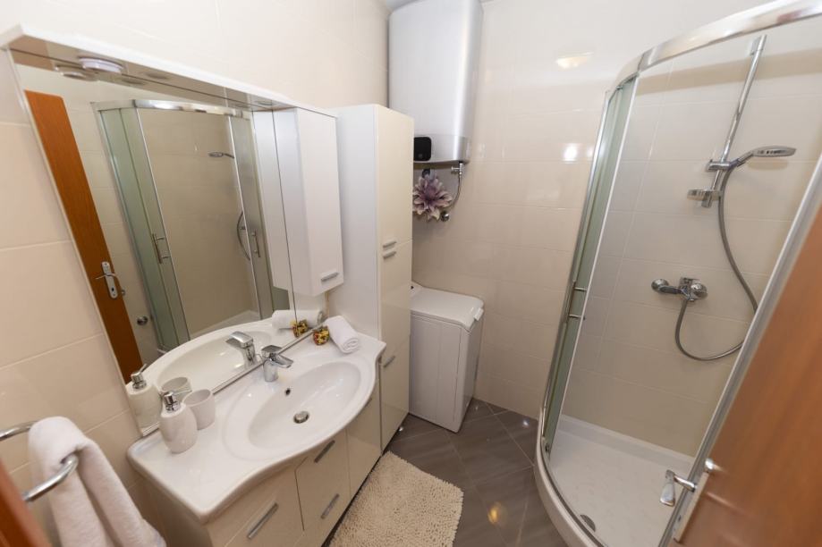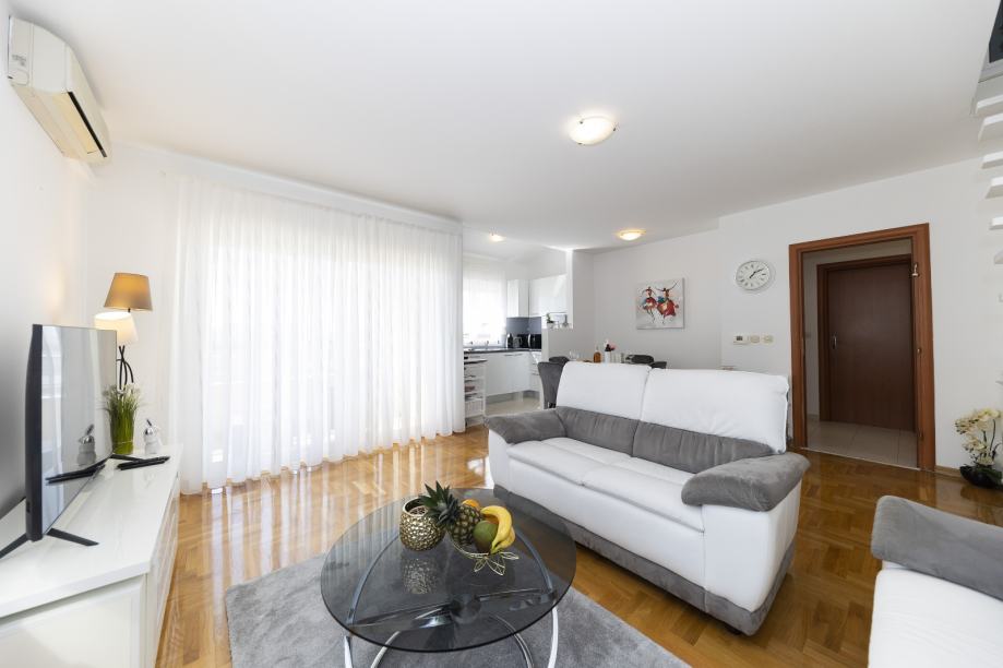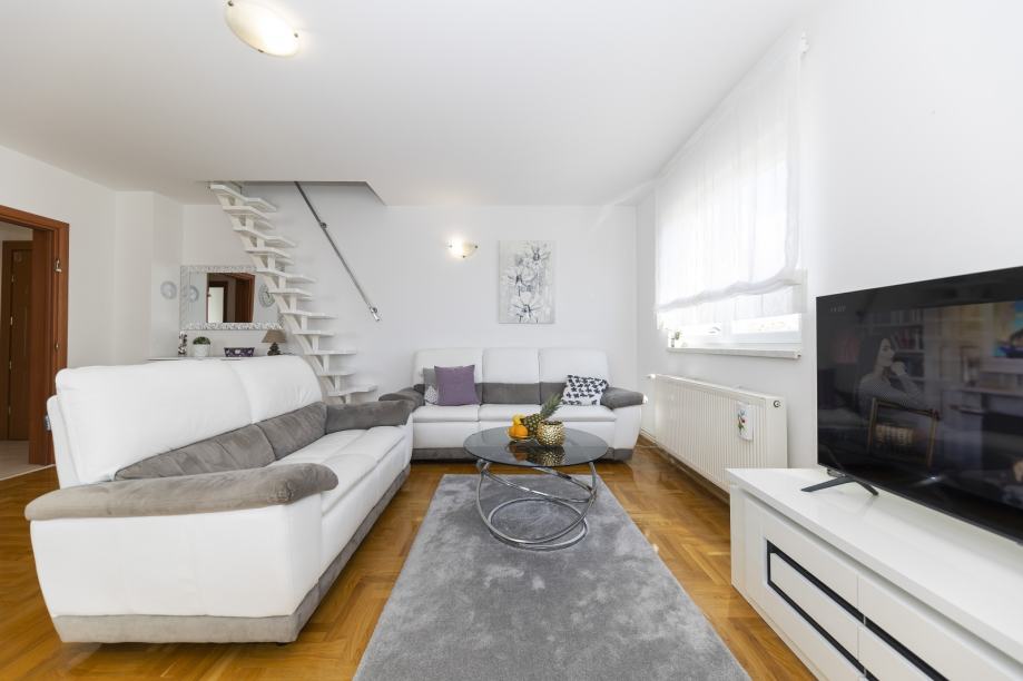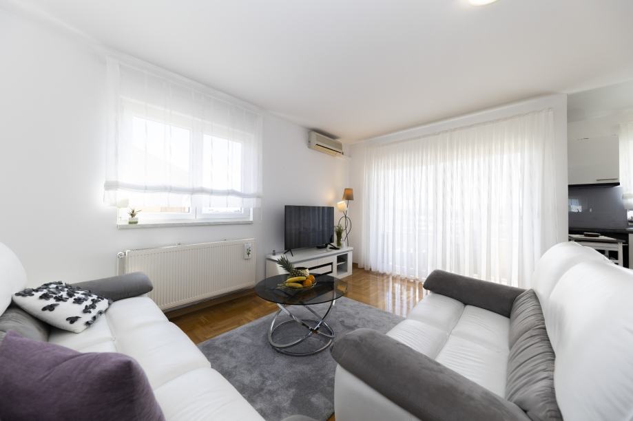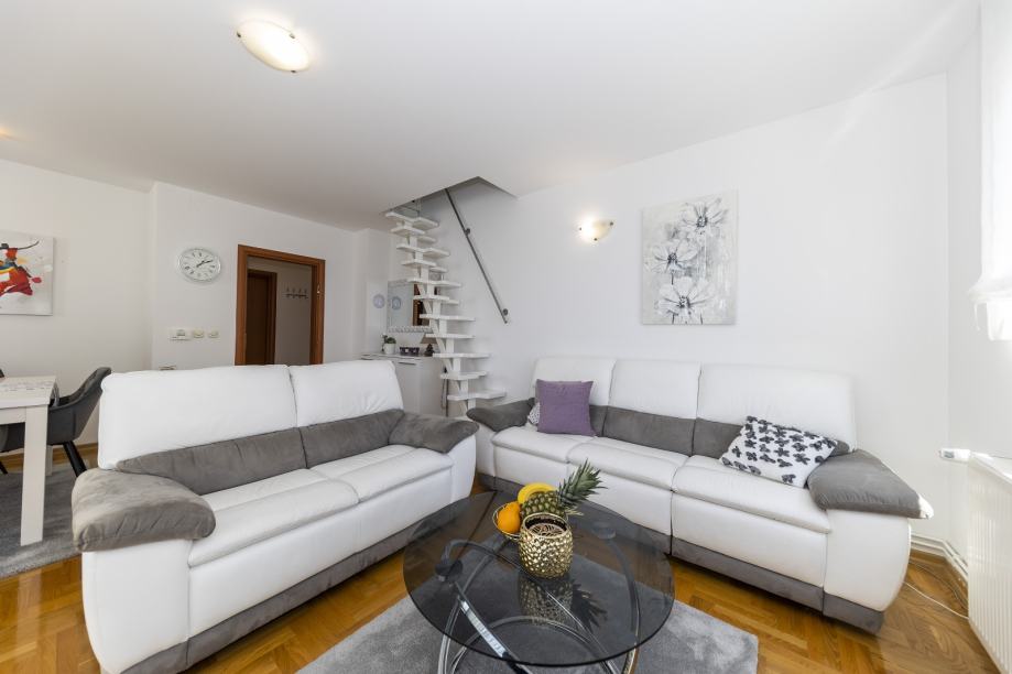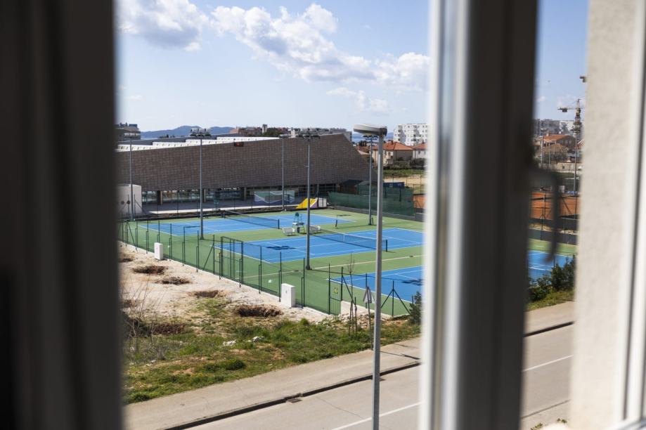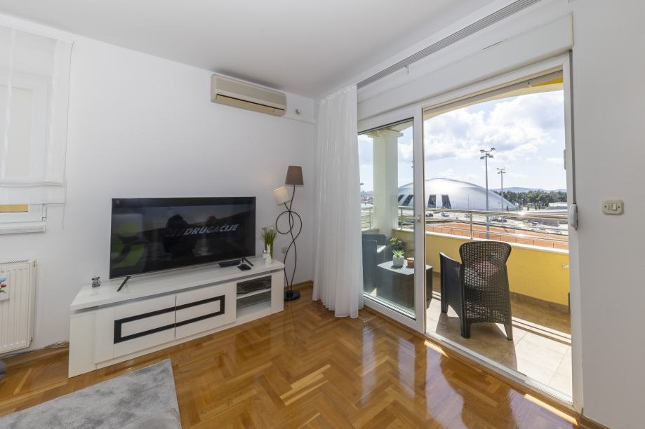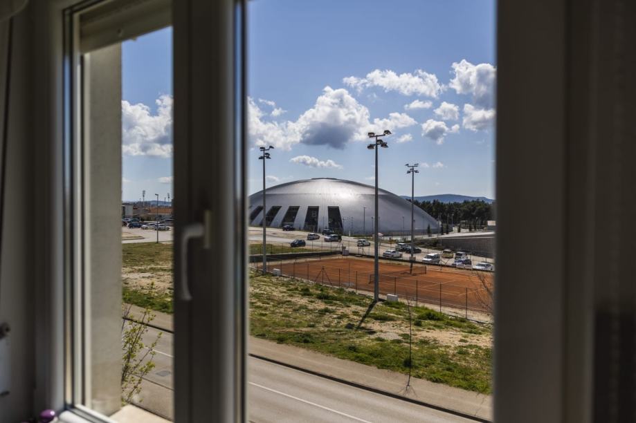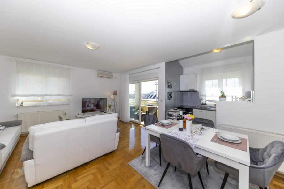 Stan nasuprot sportskog centar Višnjik površine 50 m2 plus 20.Stan se nalazi u stambenoj zgradi na mirnoj lokaciji te ima ugodan pogled na dvoranu i sportske teniske terene. Sastoji se od dnevnog boravka s kuhinjom i blagavaonicom,spavace sobe, od koje je jedna soba na katu,kupaonice i balkona.Stan je potpuno namjesten i opremljen ( klima uređaj, perilica rublja,kuhinjski aparati,centralno grijanje) te je odmah useljiv.Najam isključivo dugoročno.