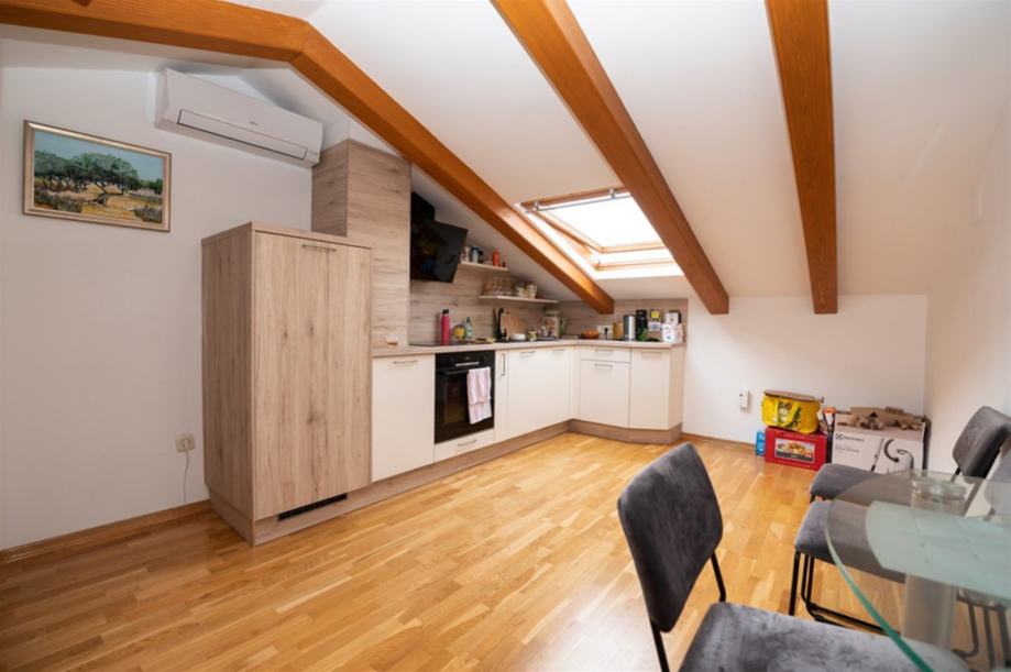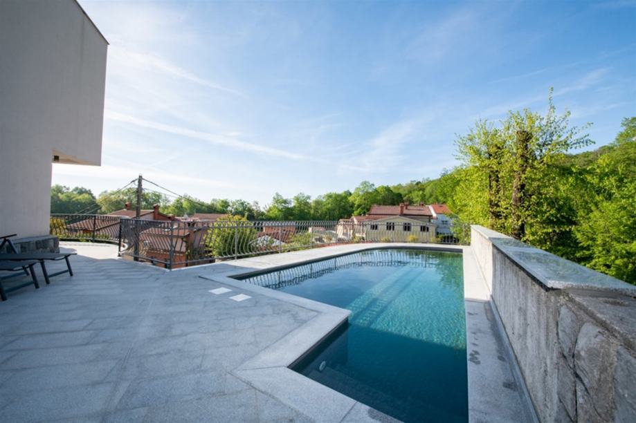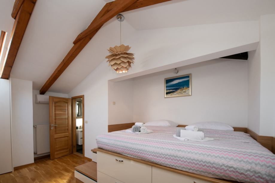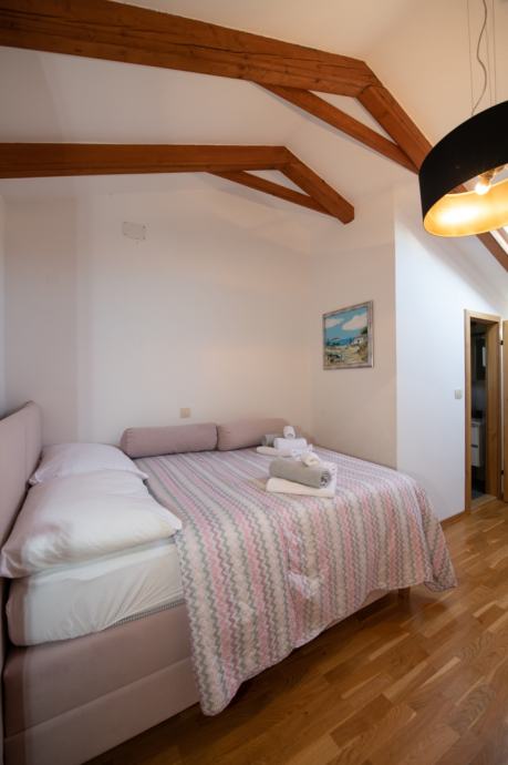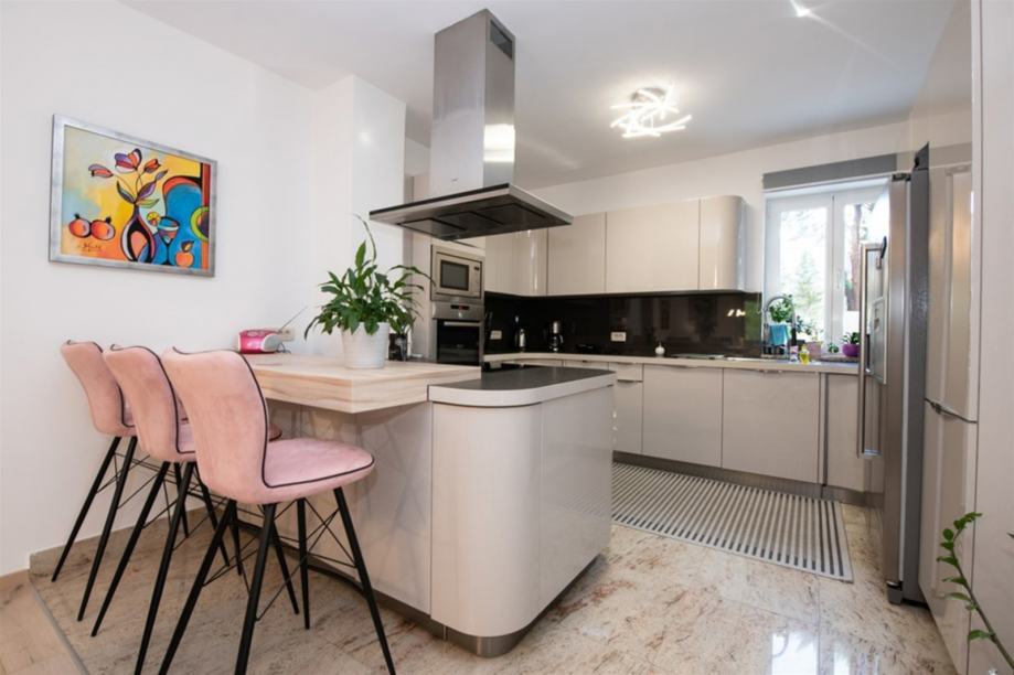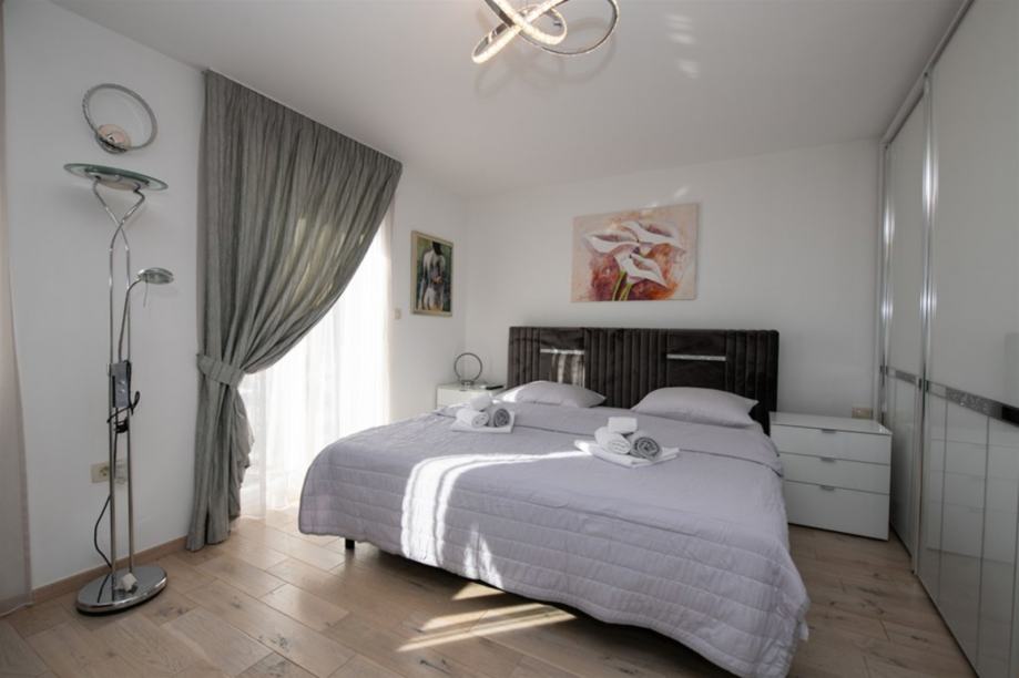U prizemlju i na prvom katu smješten je prostrani dvoetažni stan s elegantnim dnevnim boravkom, kuhinjom, blagovaonicom, dvjema spavaćim sobama s vlastitim kupaonicama, dodatnim toaletom i izlazom na terasu s bazenom i prostorom za druženje na otvorenom.