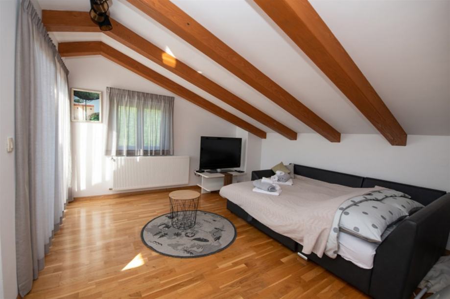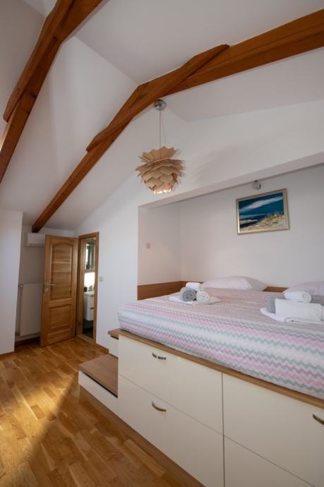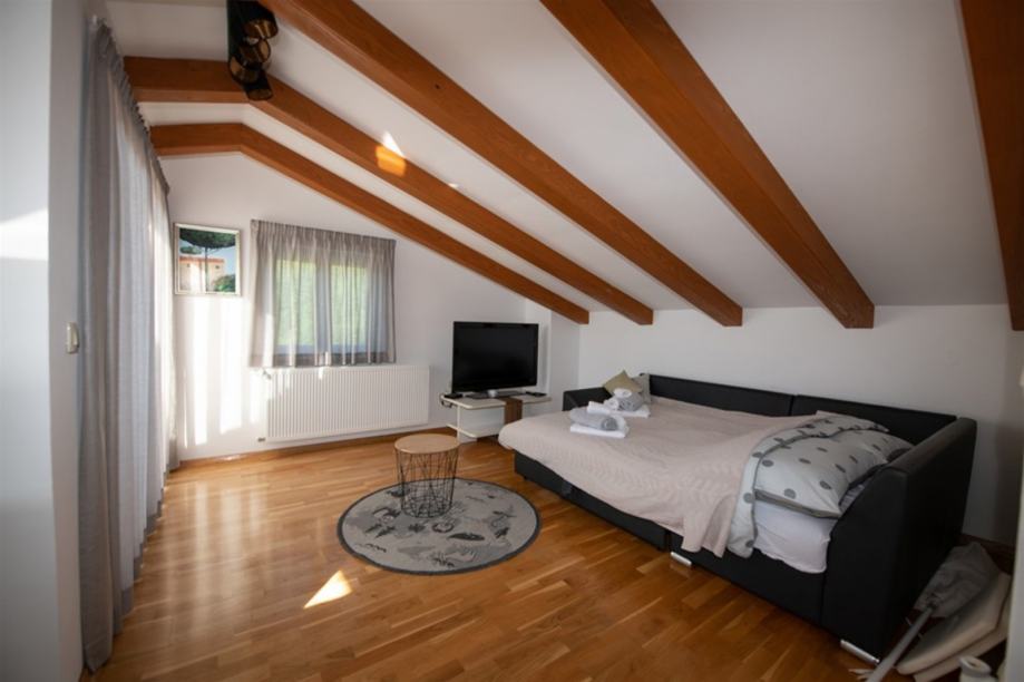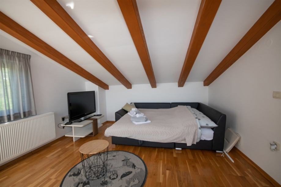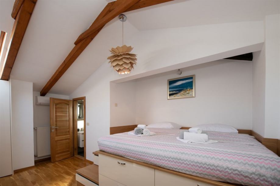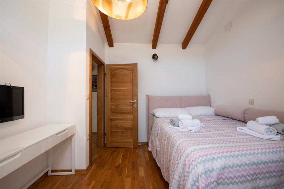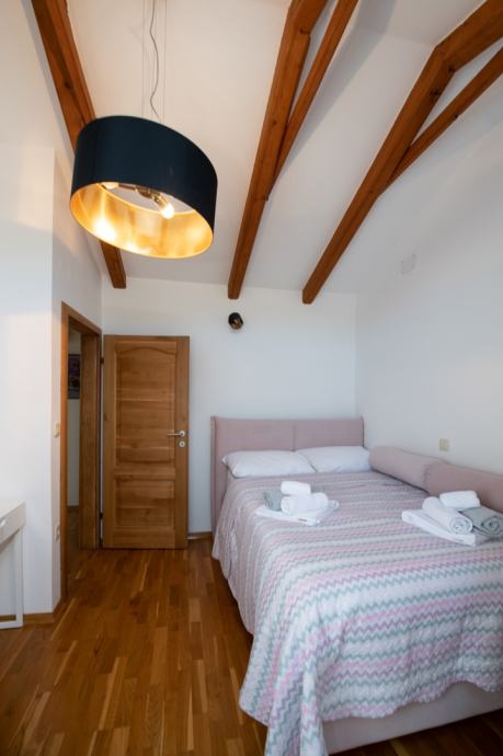 Na gornjoj etaži nalazi se drugi stan s dvije spavaće sobe, svaka s vlastitom kupaonicom, dodatnom kupaonicom, kuhinjom, dnevnim boravkom te dvjema terasama. U podrumu se nalazi garaža za više vozila te tehničke prostorije i spremište, a cijela je nekretnina ograđena i pomno uređena.