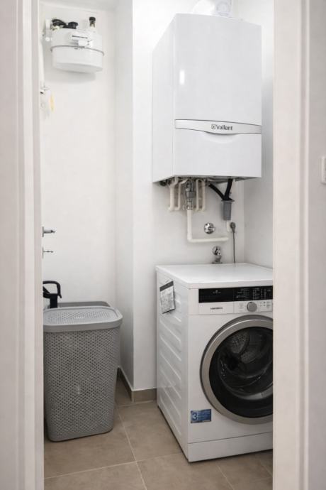 Stan je opremljen kvalitetnim materijalima i uređajima: hrastov parket I klase, vrhunska keramika i sanitarije, klima uređaj, etažno plinsko grijanje, perilica rublja, indukcijska ploča, pećnica, perilica posuđa te aluminijske električne rolete.