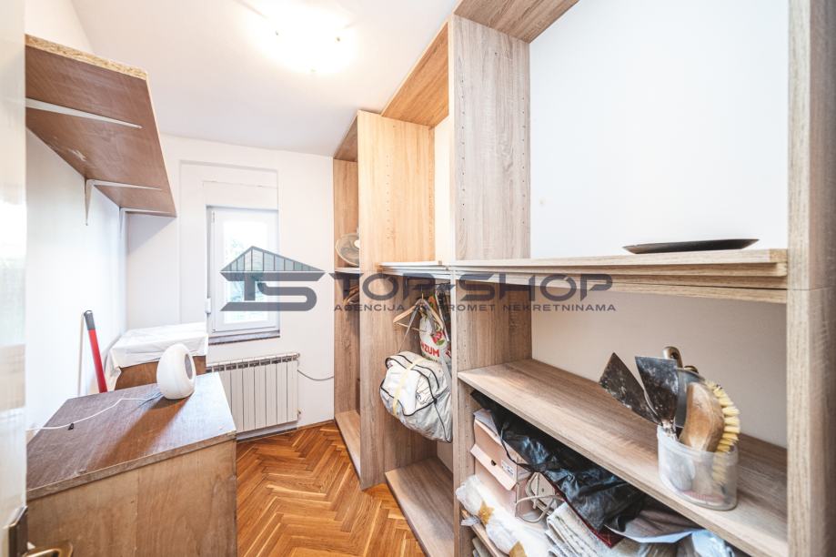 Interijer je opremljen kuhinjom s aparatima, perilicom posuđa, perilicom rublja, kadom, TV-om, krevetom i radnim stolom, što omogućuje trenutnu useljivost i udobnost. Dodatno, stanu pripada balkon, ostava/skladište, dvorište, podrum i parkiralište, što dodatno doprinosi praktičnosti svakodnevnog života.