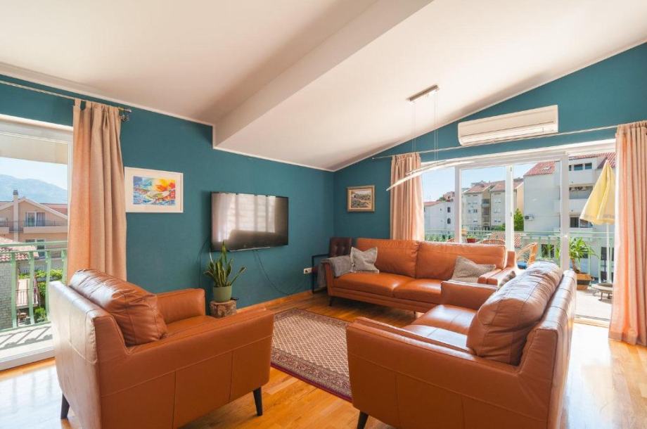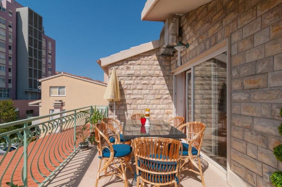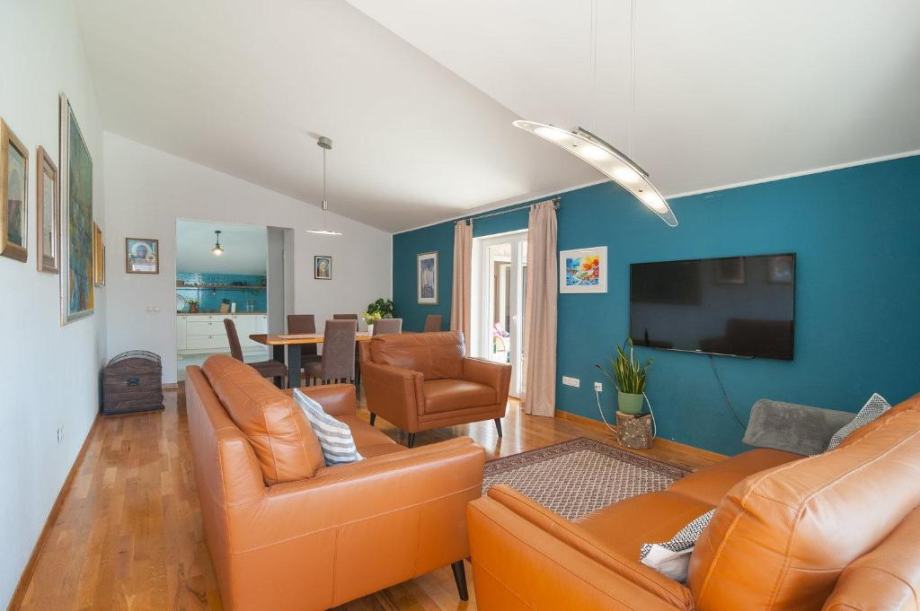 Sastoji se od ulaznog prostora, kuhinje, odvojene blagavaonice, dnevne sobe, uređene terase, tri sobe, dvije kupaonice, balkona i terase.