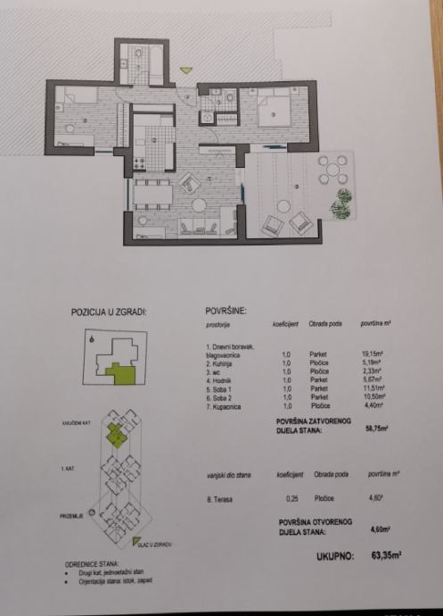 Stambena površina zatvorenog prostora je 58m2 + 20m2 otvorene terase.