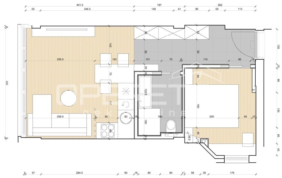 Prostor se sastoji od jedne velike prostorije/dnevnog boravka, kuhinje, odvojene sobe/ureda i kupaonice.