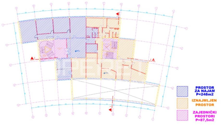 Daju se u zakup poslovni prostori na mezaninu u poslovnoj zgadi vrhunske lokacije - Savska cesta. Poslovni prostori ukupne su površine 250 m2 i sastoje se od ulaznog dijela, hodnika te 7 uredskih prostora i sanitarnog čvora. Uredski prostori su površina u prosjeku oko 30 m2.