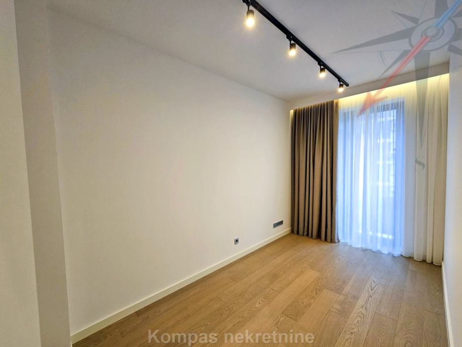 Sastoji se od hodnika, kuhinje, dvije spavaće sobe, dvije kupaonice, toaleta, podruma ( 39 m2 ) koji se može urediti prema potrebama najmoprimca. Dodatni sadržaji: loggia ( 5 m2 ), terasa ( 11 m2 ), dvorište ( 38 m2 ). Upravljanje rasvjetom, podnim grijanjem (toplinske pumpe), klimatizacijom, filtracijom zraka, roletama i tendama putem panela ili mobilne aplikacije. Pripada mu garaža za dva vozila ( 38 m2 ). Pričuva za stan je oko 250 eura, a uključuje čišćenje zajedničkih prostora, održavanje zelenila i zaštitarsku službu. Cijeli kompleks je pod 24/7 videonadzorom, ima zaštitarsku službu, a pristup je kontroliran putem elektroničkih ključnih oznaka.