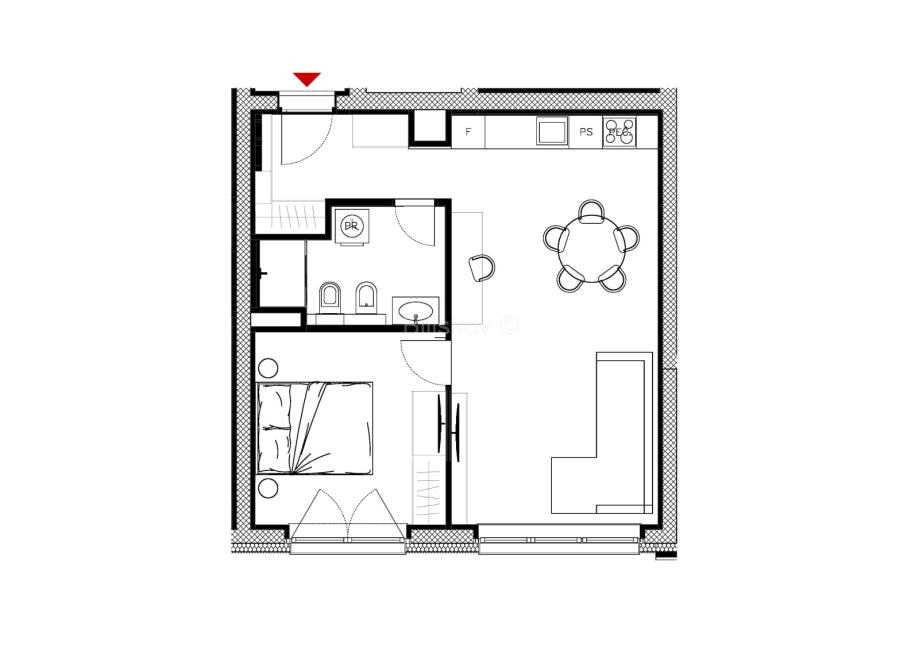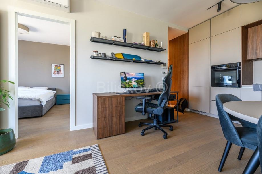 Stan se sastoji od spavaće sobe, open space kuhinje i dnevnog boravka, kupaonice i ulaznog hodnika.
