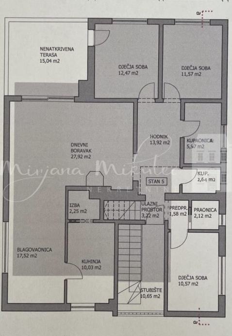 Stan se sastoji od; dva dnevna boravka, četiri spavaće sobe, walk in ormara, dvije kupaonice, jednog toaleta, dvije terase (15 m2 i 7,7 m2).