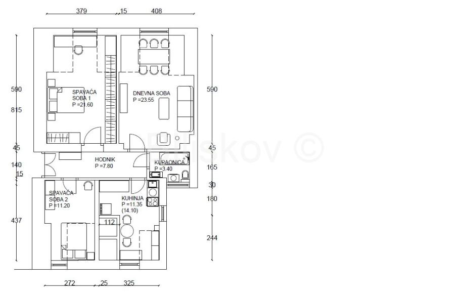 Stan se sastoji od ulaznog prostora, dvije spavaće sobe, dnevnog boravka, kuhinje te kupaonice.