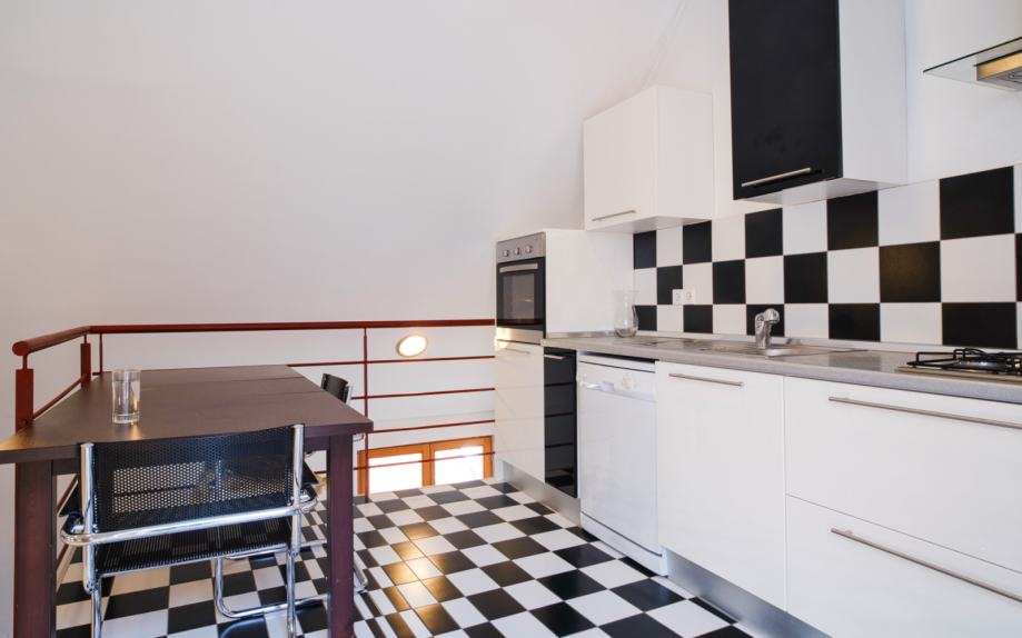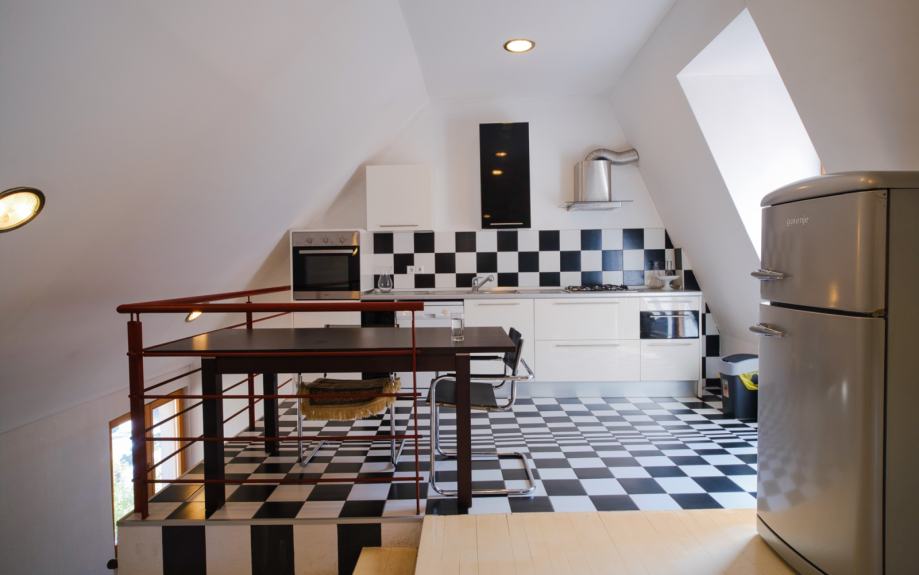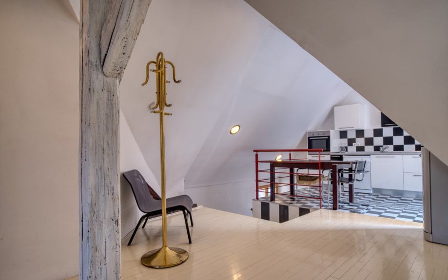 Donji dio stan je otvorenog tipa, ovdje se nalazi potpuno opremljena kuhinja i veliki boravak s više opcija za sjedenje. Iz kuhinje se može izaći na terasu, gdje se može uživati uz jutarnju kavu s jedinstvenim pogledom na Zagrebačku katedralu i izlazak sunca.
