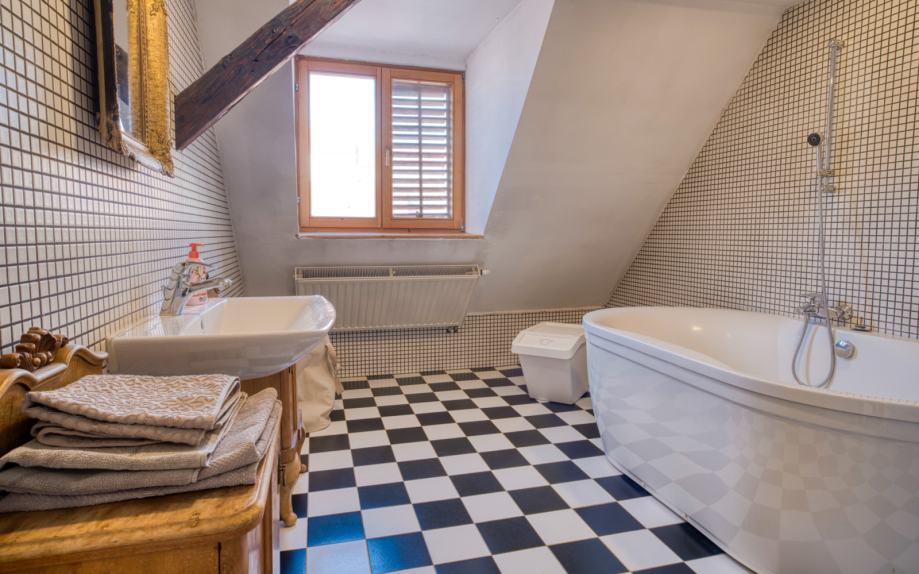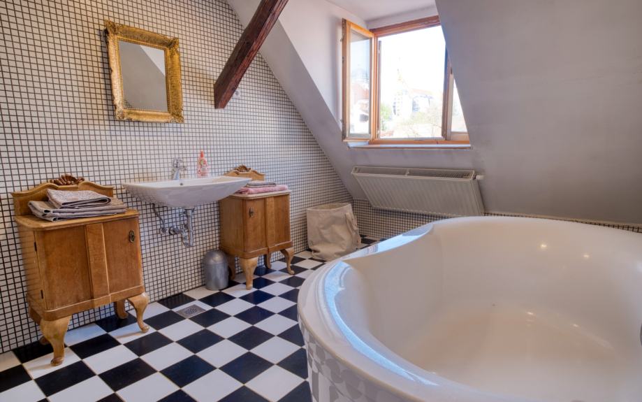 U donjem djelu stana se nalazi i ogromna lijepo uređena kupaonica s velikim okruglim kadom iz koje se kroz prozor vide krovovi starog Zagreba. Pored kupaonice je još jedna prostorija, namijenjena kao spremište, gdje se nalazi kvalitetna perilica za rublje s funkcijom sušilice.