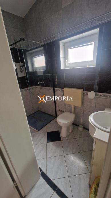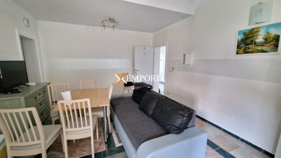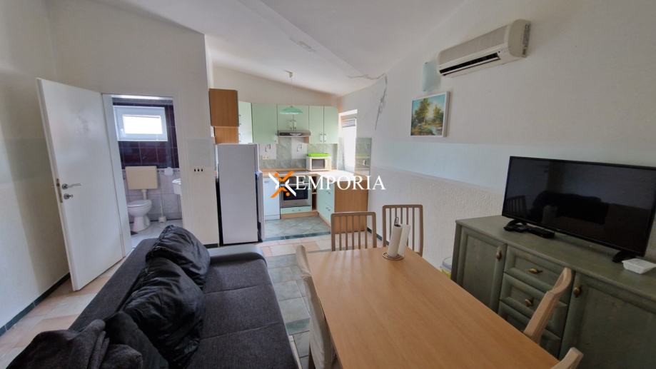 Stan se sastoji od kuhinje s blagovaonicom i dnevnim boravkom, dvije spavaće sobe te kupaonice. Uz apartman dolazi i jedno vanjsko parkirno mjesto koje će biti osigurano kao vanknjižno vlasništvo.OpremaZgrada je građena od cigle, a fasada je izvedena sa zrnatom obradom preko stiropora. Apartman ima PVC stolariju s PVC griljama, keramičke pločice na podovima i obična ulazna vrata. Krov je kosi, a grijanje nije instalirano. Za hlađenje služi jedan klima uređaj. Apartman se prodaje namješten i nema vanjski roštilj. Pristup je osiguran javnim asfaltiranim putem, a stan nudi djelomičan pogled na more.
