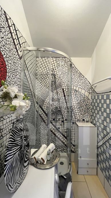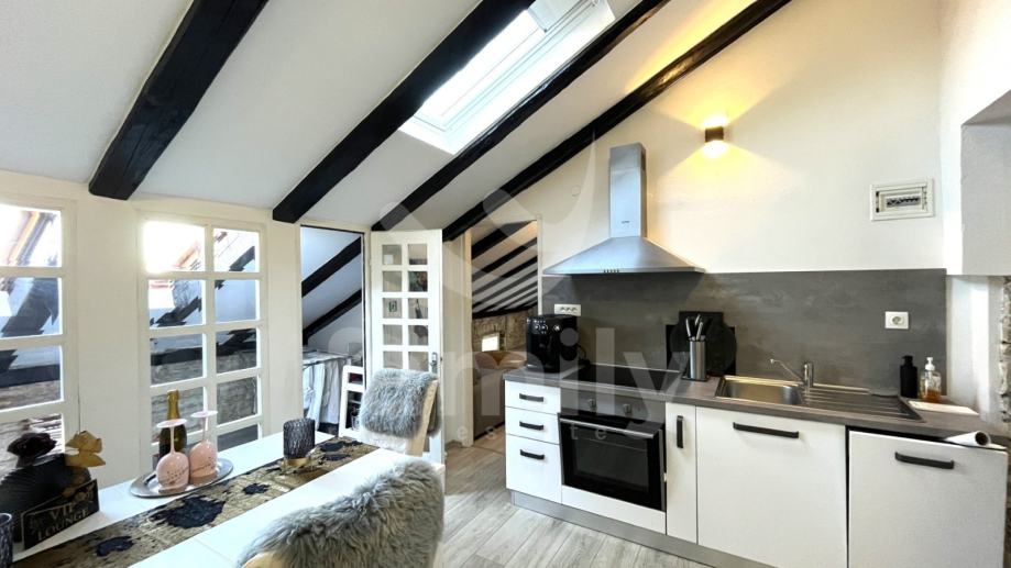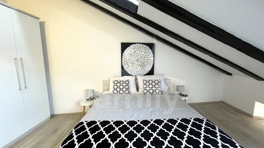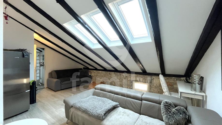 Nadomak samoga centra grada Pule smješten je ovaj atraktivni prostrani stan 62 m2 na trećem katu stambene zgrade. Stan se nalazi u potkrovlju i sastoji se od: ulaznog hodnika, kupatila, dnevnog boravka, kuhinje s blagavaonicom, jednom spavaćom sobom i zatvorene terase. Stan se prodaje uređen i namješten. Za grijanje se koristi peć na drva, a za hlađenje se koriste tri jedinice klima uređaja od kojih je u svakoj sobi po jedna. U svim sobama je položen laminat. Postoji mogućnost da se dnevni boravak prenamjeni u još jednu spavaću sobu. U dvorištu zgrade nalazi se privatni parking.