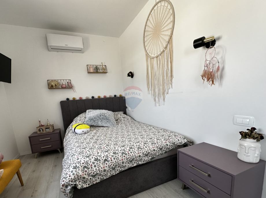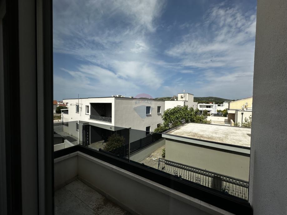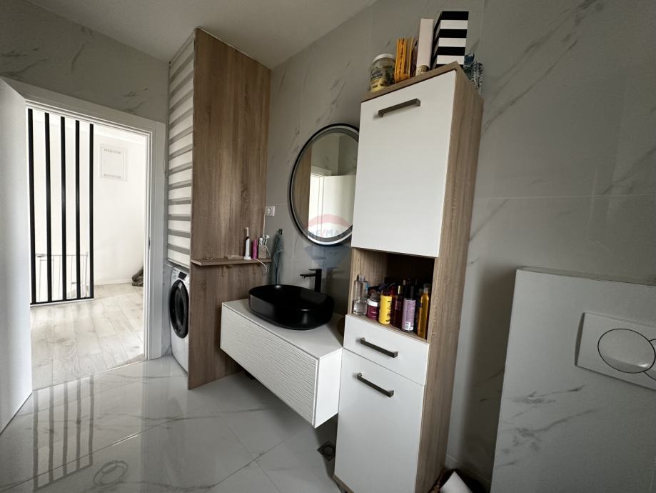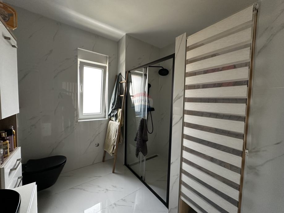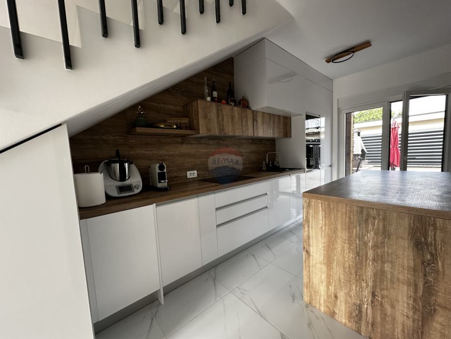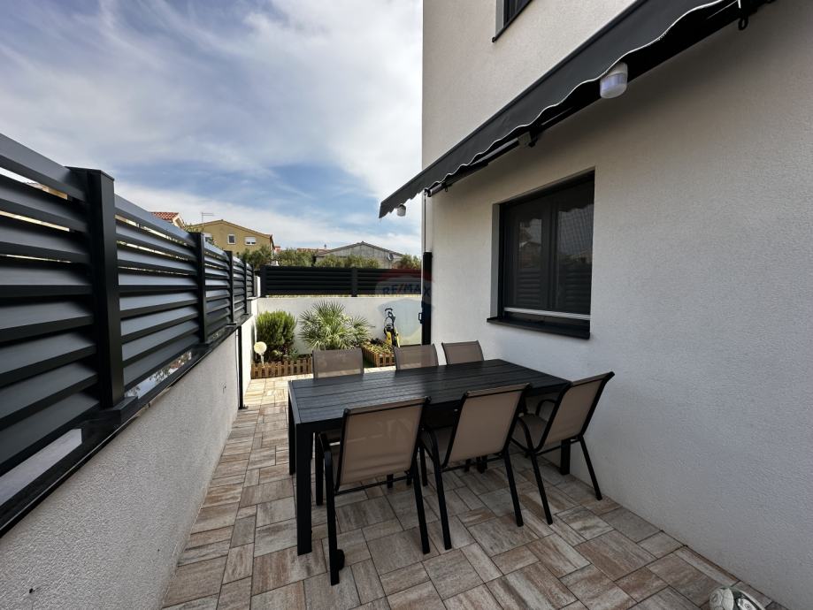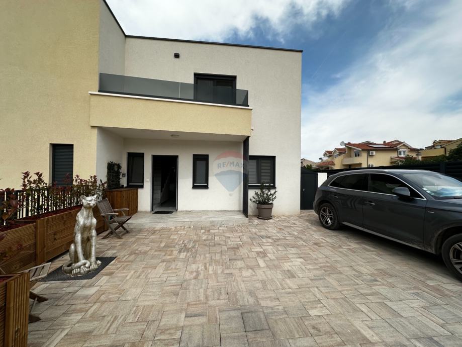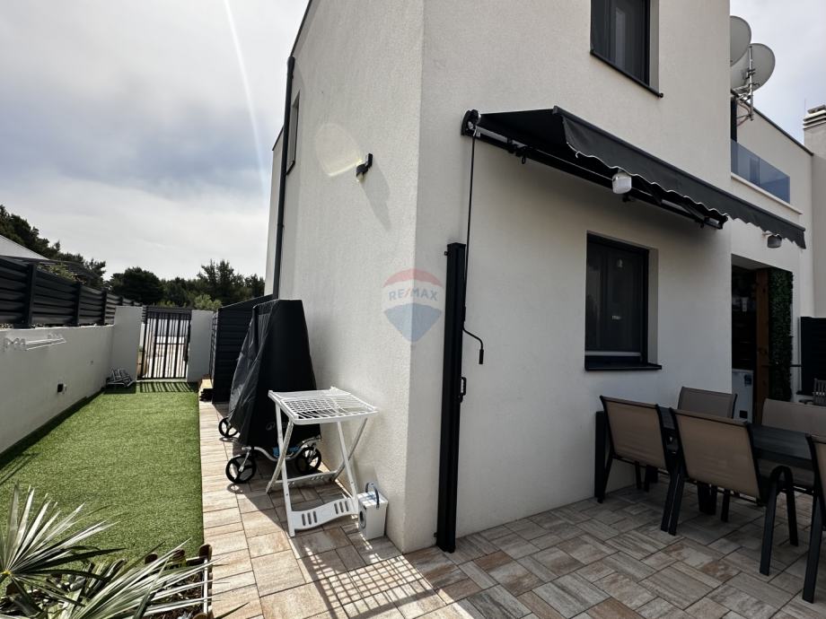 Prodaje se prekrasna dvojna kuća s dvorištem u mirnom dijelu Vodica. Kuća ukupne stambene površine 99,08 m2 sastoji se od prizemlja u kojem se nalaze kuhinja spojena s blagovaonom i dnevnim boravkom u "open space" koncept, kupaonica s toaletom te jedna spavaća soba. Na katu su se smjestile još dvije spavaće sobe s garderobom te velika kupaonica s toaletom. Obje spavaće sobe na katu imaju vlastite balkone s kojih se pruža pogled na more. U dvorištu kuće veličine 43m2 smjestio se roštilj, blagovaonski stol te kućica za alat, a kući pripadaju tri parkirna mjesta. Kuća je klimatizirana, ima podno grijanje u kuhinji, dnevnom boravku i kupaonicama, a prodaje se kompletno namještena. Savršeno funkcionalnim rasporedom prostorija, ova kuća čini izvrsnu priliku za miran obiteljski život ili ugodni boravak tijekom ljetnih mjeseci.