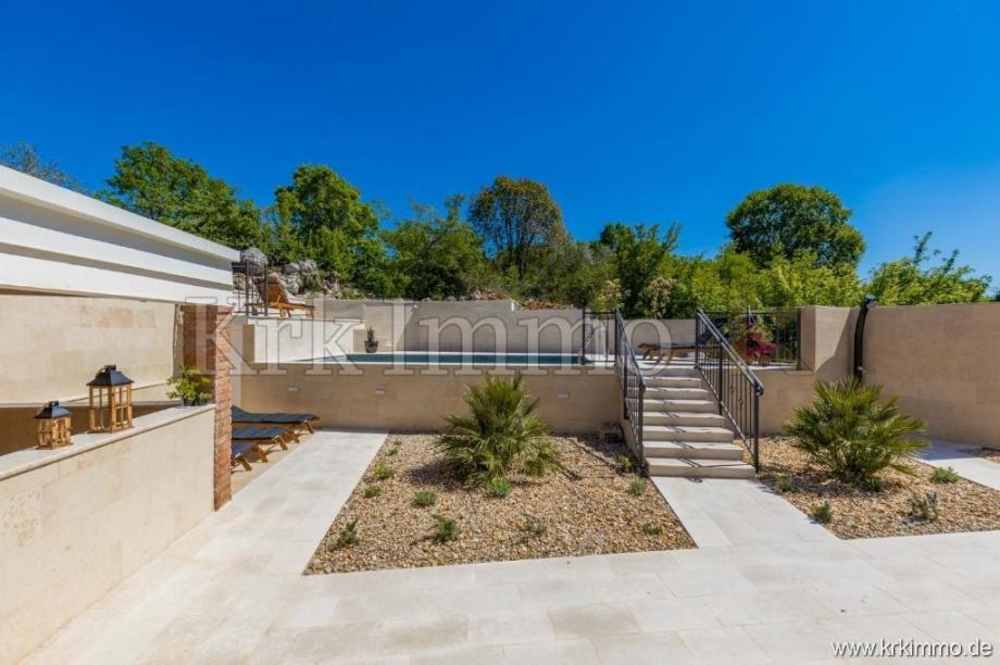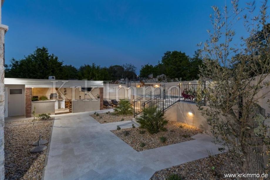 Okućnica od 445 m² uređena je i ograđena, zasađena mediteranskim biljem koje stvara privatnu oazu mira. U središtu vrta nalazi se grijani bazen sa slanom vodom i prostranim sunčalištem, a tu su i vanjski tuš, dva parkirna mjesta, dva spremišta te vanjski WC. Za gurmane i ljubitelje druženja na otvorenom, tu je ljetna kuhinja s roštiljem i natkrivenom terasom.