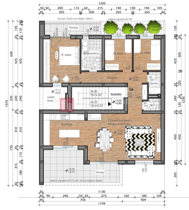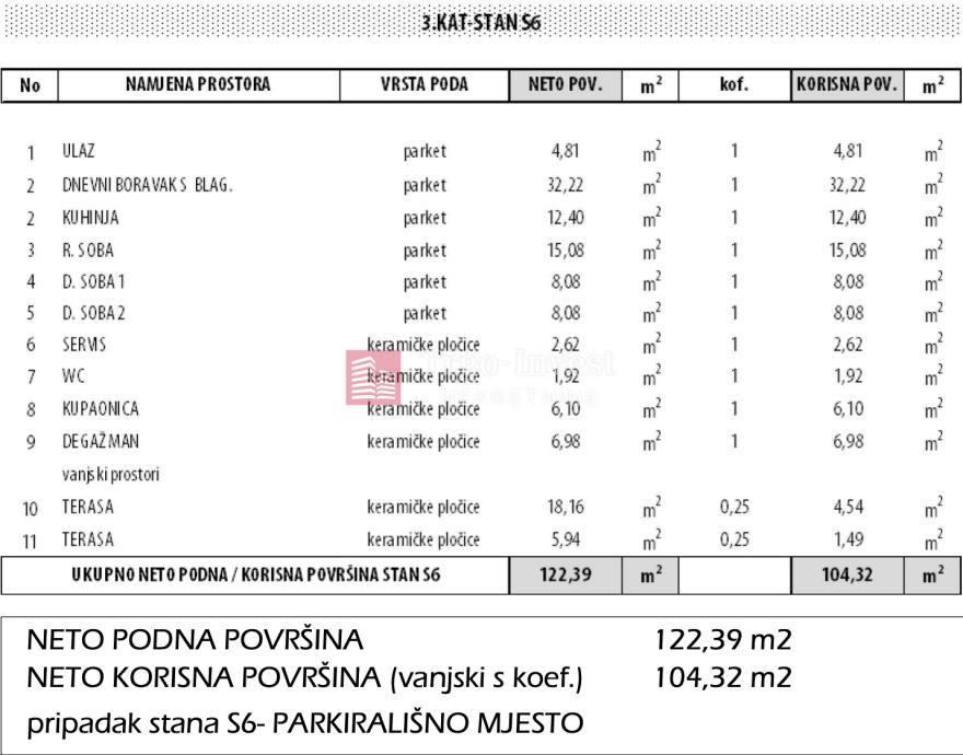 Stan se sastoji od ulaza, kuhinje/blagovaonice/dnevnog boravka - otvorenog tipa, hodnika, tri spavaće sobe, kupaonice, WC-a, servisa i 2 terase, stambene površine 104,32 m2.
