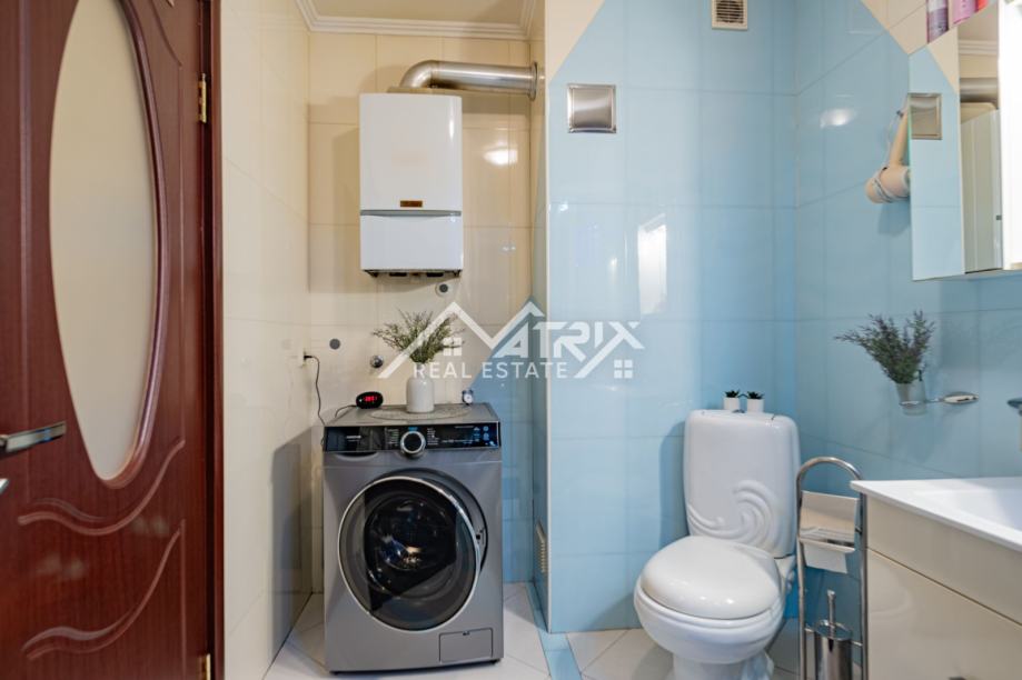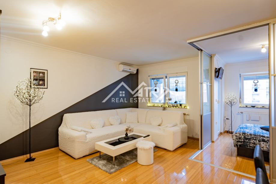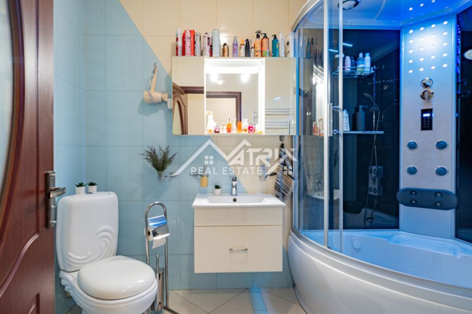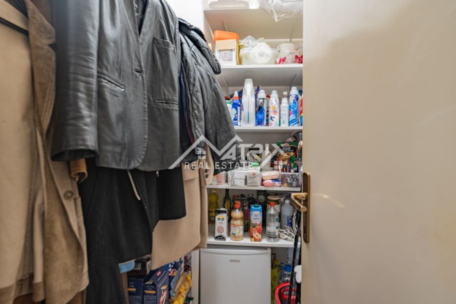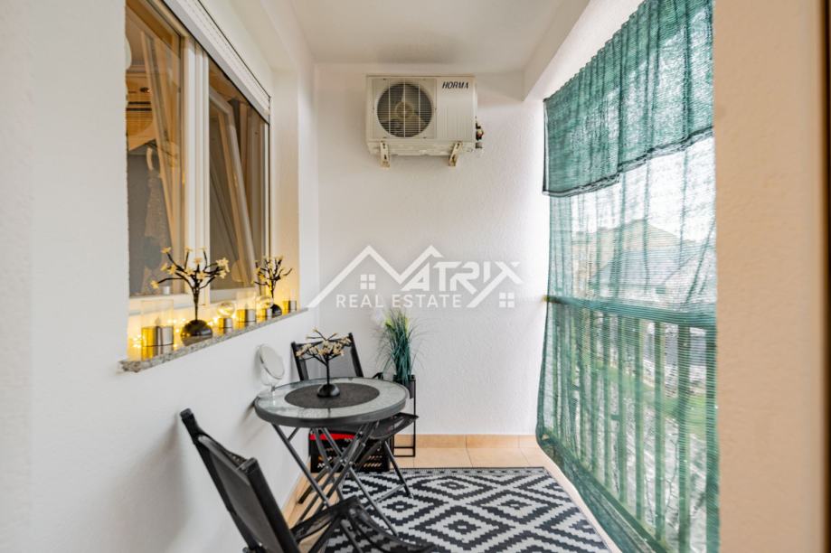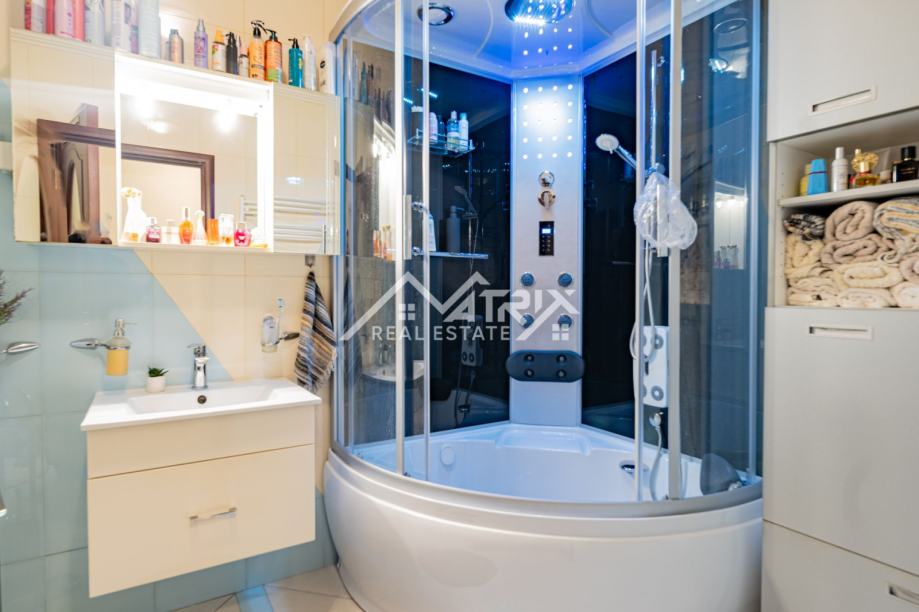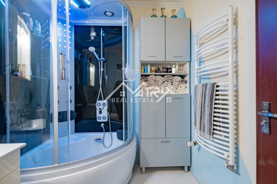 Interijer ostavlja dojam dobrog održavanja, s toplim drvenim podovima i modernim detaljima koji stvaraju ugodnu atmosferu. U dnevnoj zoni nalazi se klima-uređaj, koristan za ugodnu temperaturu kroz sva godišnja doba. Kupaonica je suvremeno uređena te pruža dodatni komfor zahvaljujući kutnoj tuš-kabini i hidromasažnom stupu.