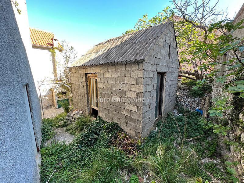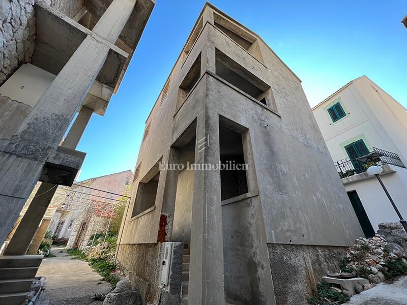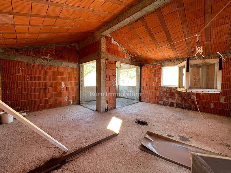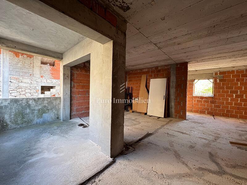 Kuća se sastoji od 3 jednosobna apartmana svaki sa svojom lođom. U dvorištu kuće se nalazi prizemni objekt površine 17 m2 koji je moguće urediti kao malu ljetnu kuhinju ili konobu. Stepenište u unutrašnjosti kuće povezuje etaže. Nekretnina je u grubim građevinskim radovima stavljena pod krov, te ju je potrebno dovršiti. Struja i voda su dovedeni u kuću. U potpunosti je južno orijentirana, a nalazi se na fantastičnoj lokaciji, udaljenoj samo jednu minutu šetnje od mora i prekrasne šljunčane plaže. Javni parking je dostupan u neposrednoj blizini kuće.