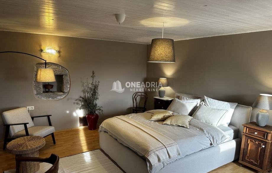 Kat: prostrani dnevni boravak, dvije spavaće sobe (manja prolazna i glavna spavaća soba)