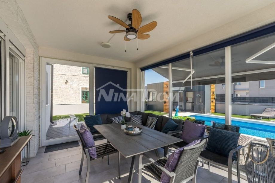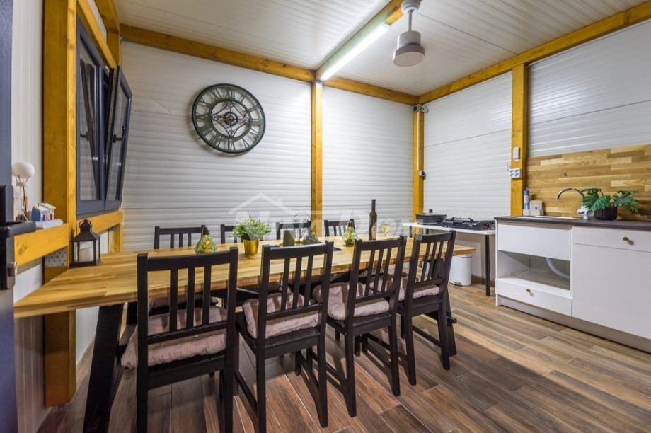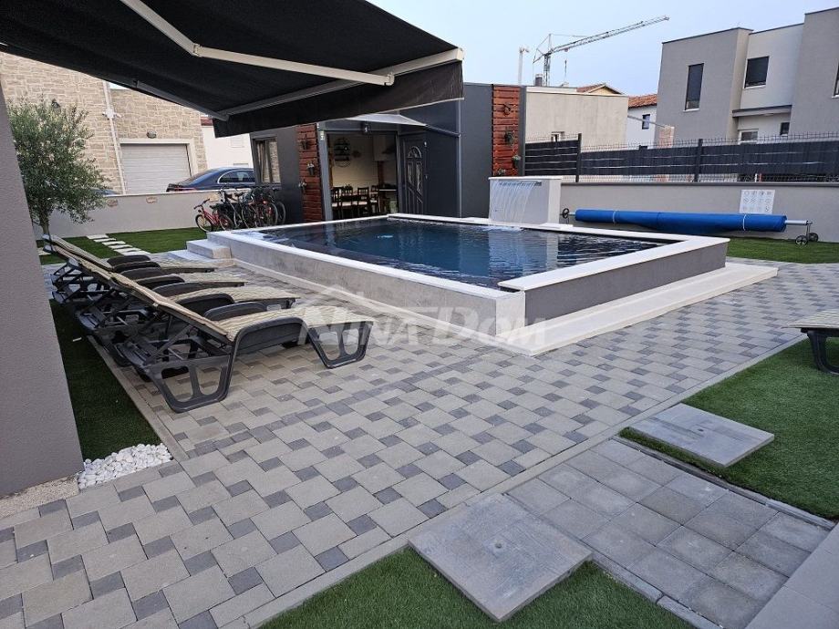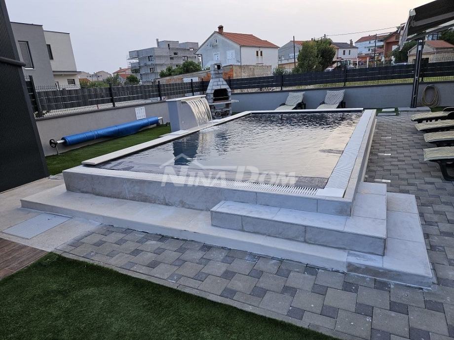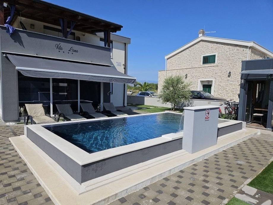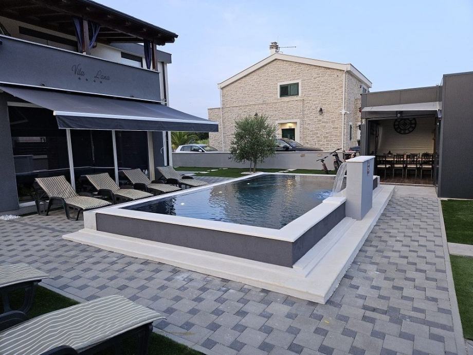 Okućnica uređena s bazenom 36 m2 s toplotnom pumpom., sjenica s roštiljem i prostorom za družanje.