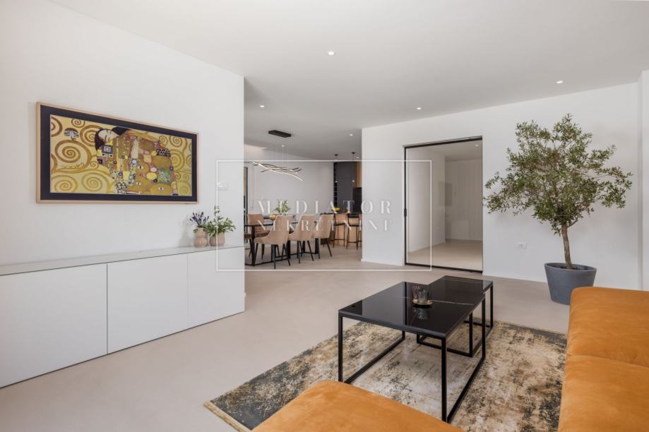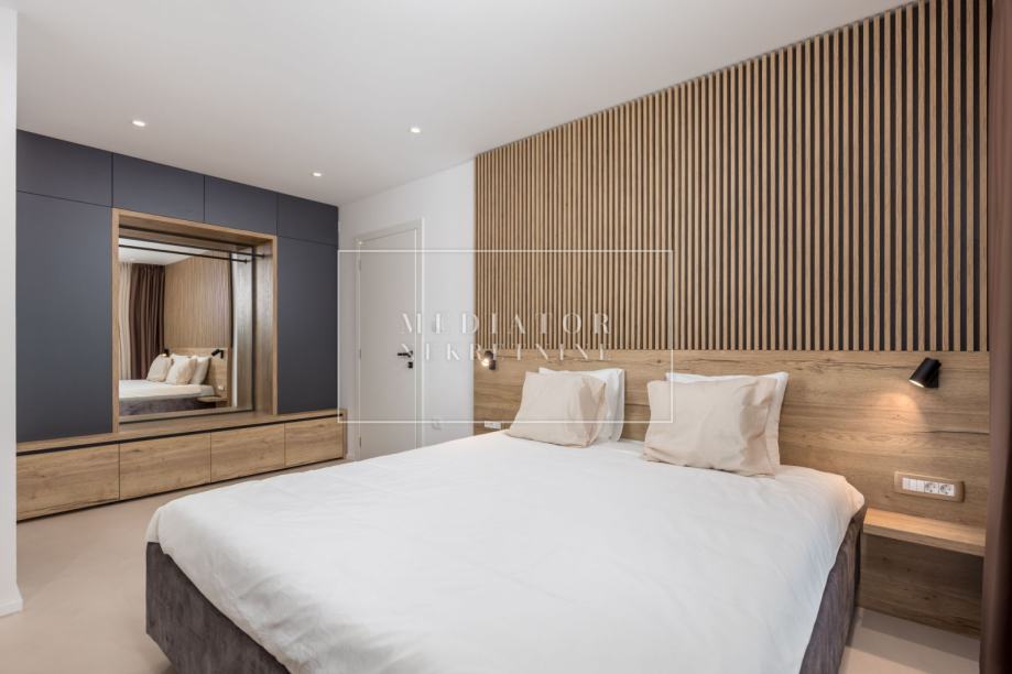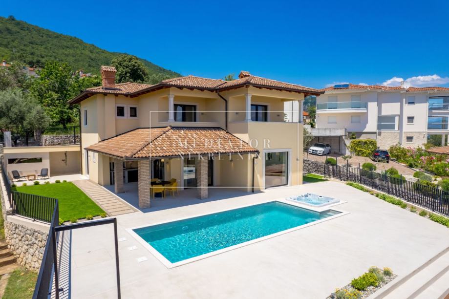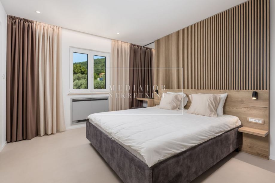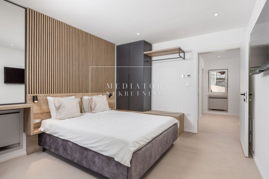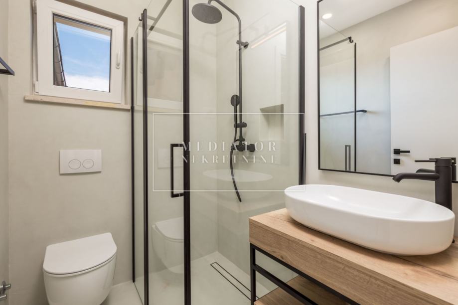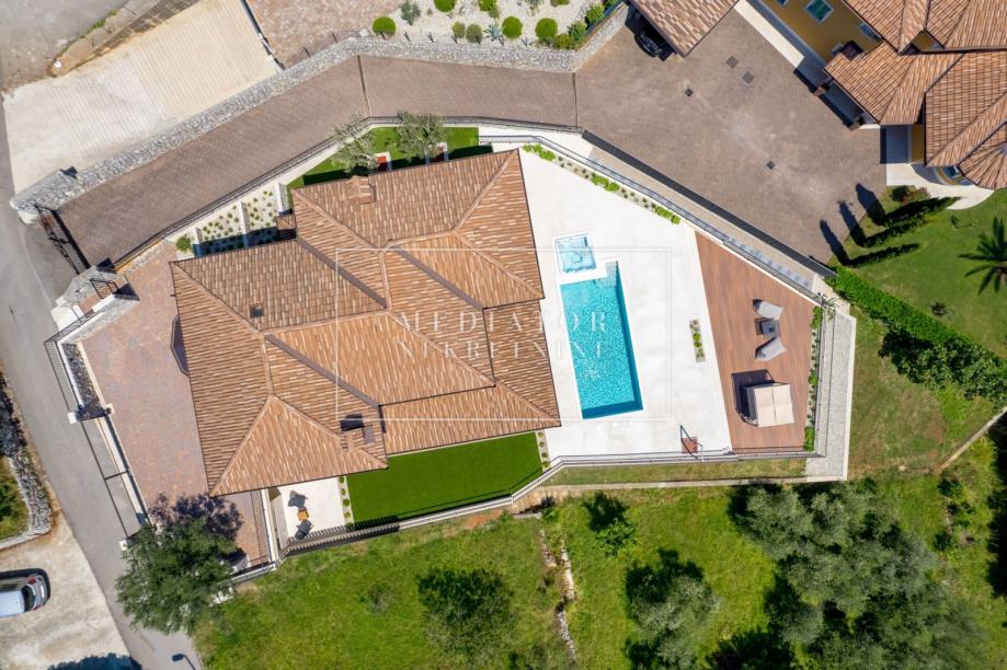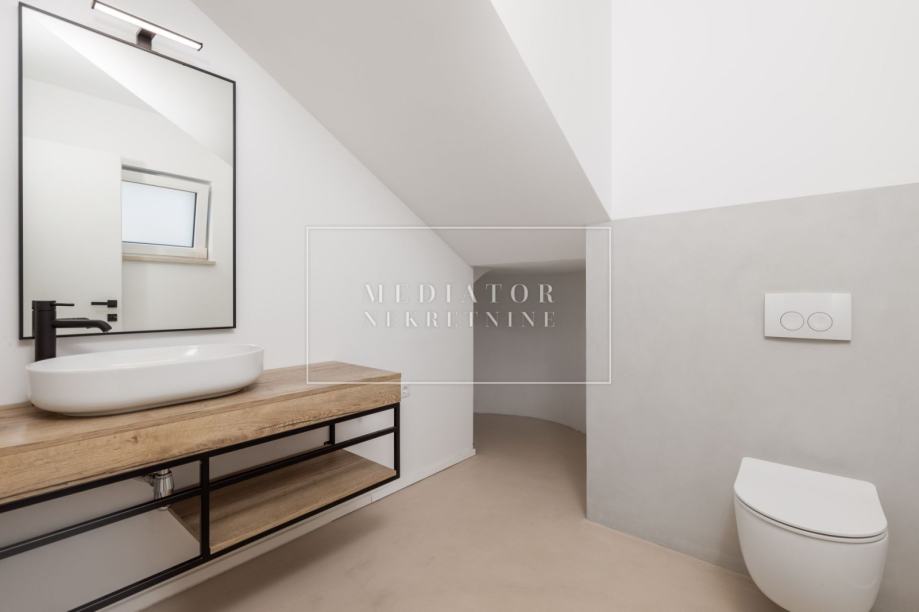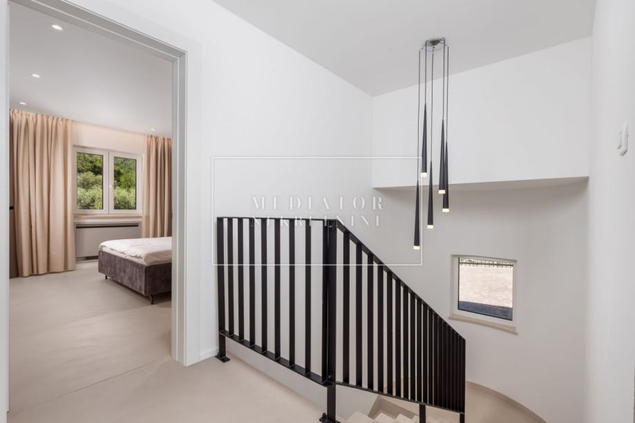 Kuća se prostire na dvije etaže od ukupno 160 m2 unutarnjeg neto prostora. U prizemlju se nalazi veliki dnevni boravak s kuhinjom i blagovaonicom s izlazom na dvorište i natkrivenom terasom s velikim roštiljem i bazenom od 40 m2. U prizemlju se nalazi i spavaća soba s kupaonicom te sauna.