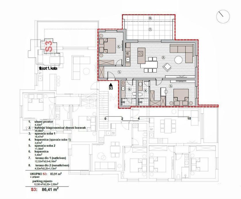 Sastoji se od ulaznog prostora, blagovaonice, kuhinje, dnevnog boravka, dvije spavaće sobe, dvije kupaonice, natkrivene i nenatkrivene terase.