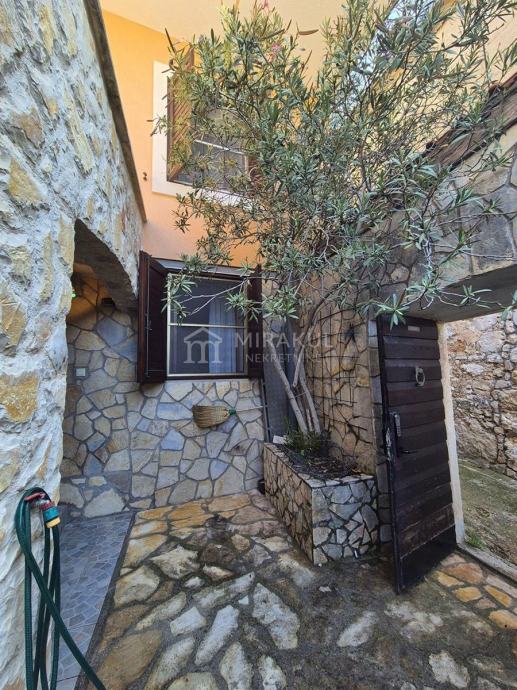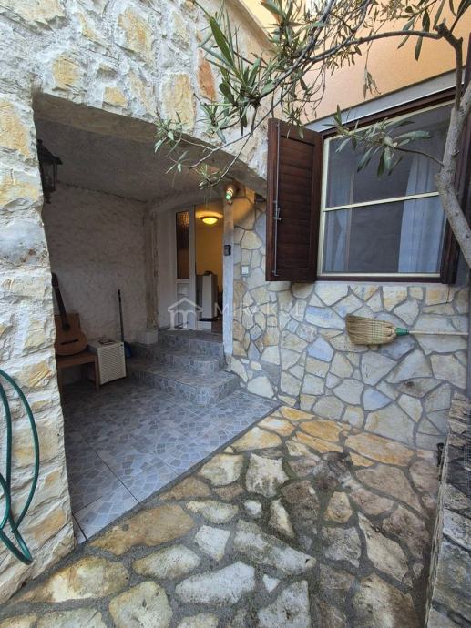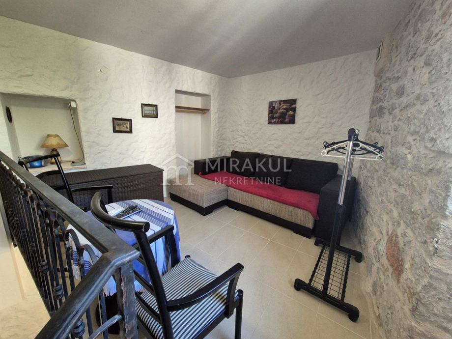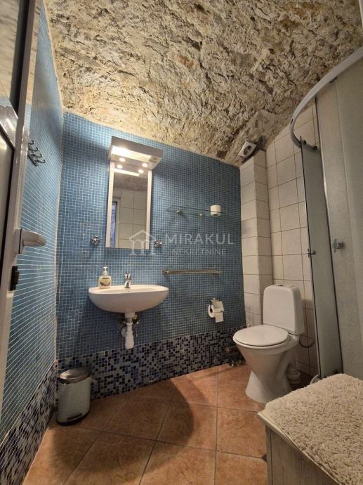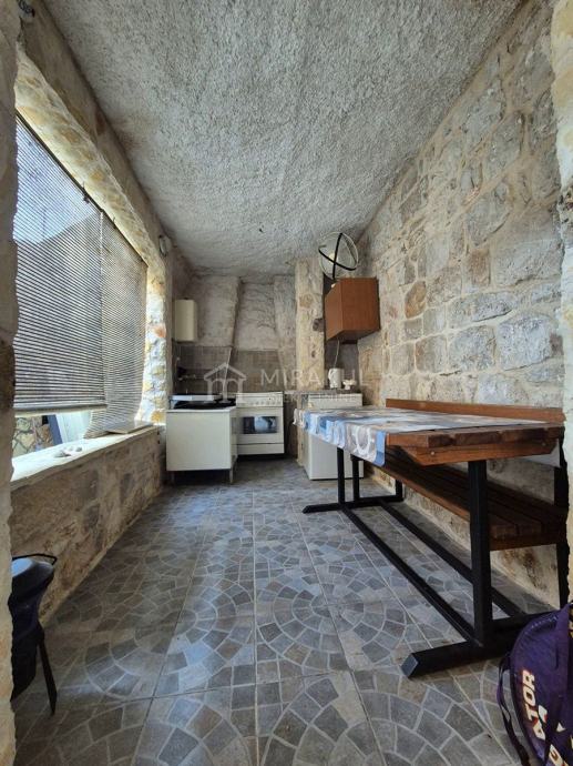 Galerija – Apartman s posebnim ulazom, uređen u mediteranskom stilu s vidljivim kamenom na dvaju zidova, originalnim kamenim stropom u kupaonici smještenom na mjestu stare gusterne. Opremljena kuhinja , klima uređaj za grijanje i hladjenje.