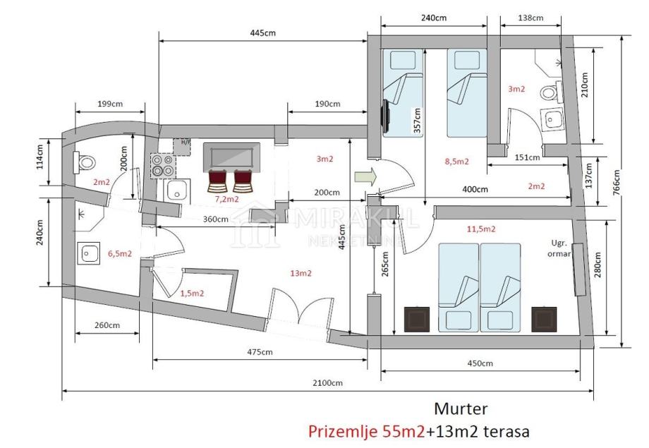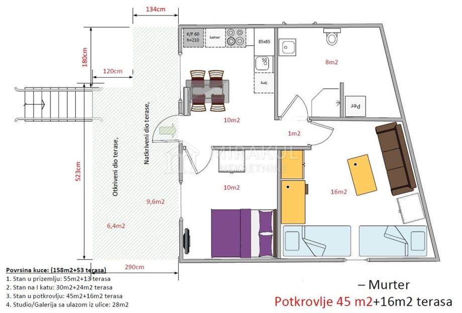 Ukupna stambena površina iznosi 158m² (ne računajuci unutarnje zidove) te ima dvije prostrane terase od 53 m².