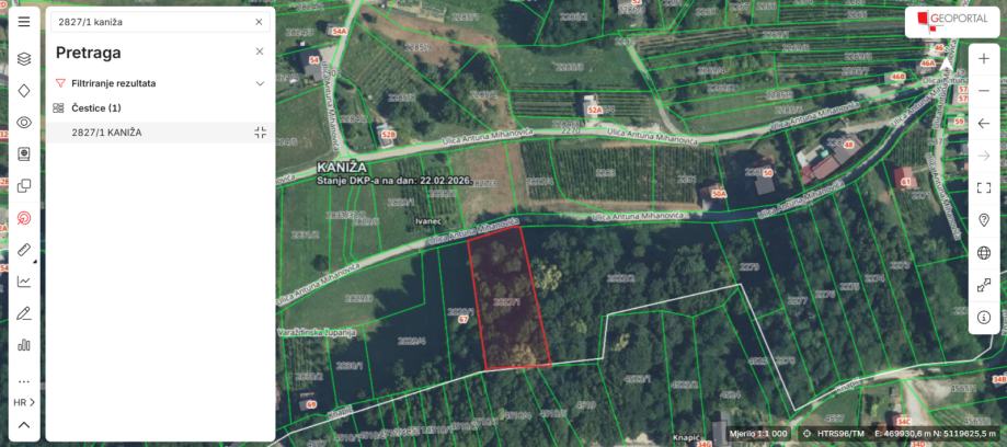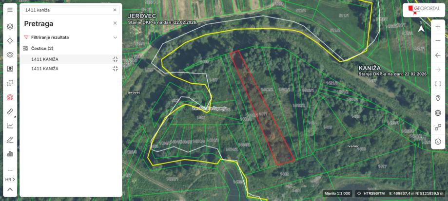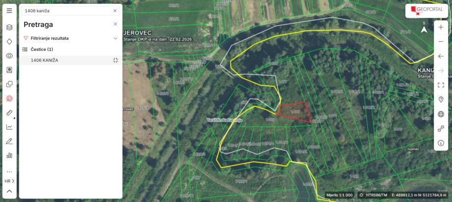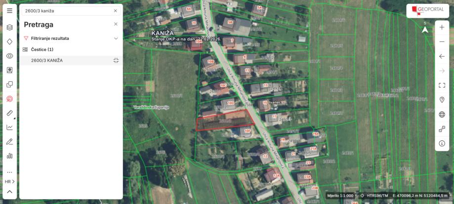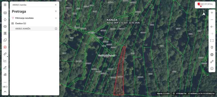 Na mrežnim stranicama Geoportala, ukucavanjem broja katastarske čestice i naziva katastarske općine u tražilicu, možete doći do geografskog prikaza i pojedinosti svake od parcela.