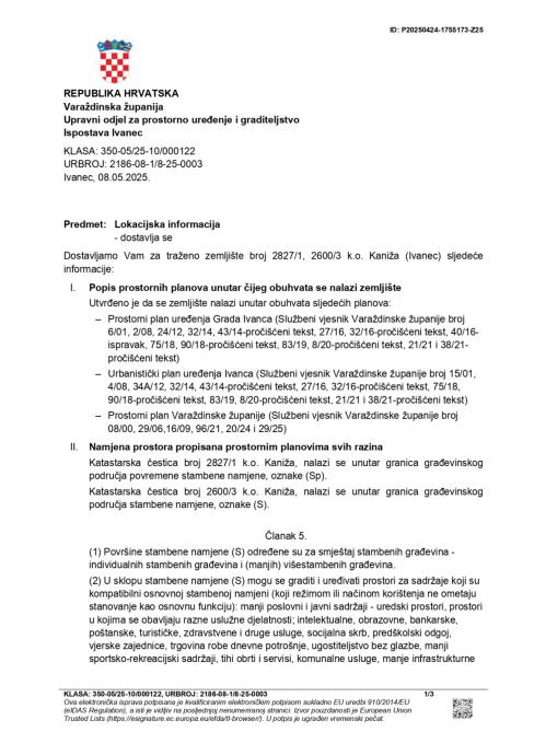 A) građevinsku parcelu od 745 m2 u području stambene namjene (S) u Ivancu, A. Mihanovića 10E (k.č. 2600/3, k.o. Kaniža)