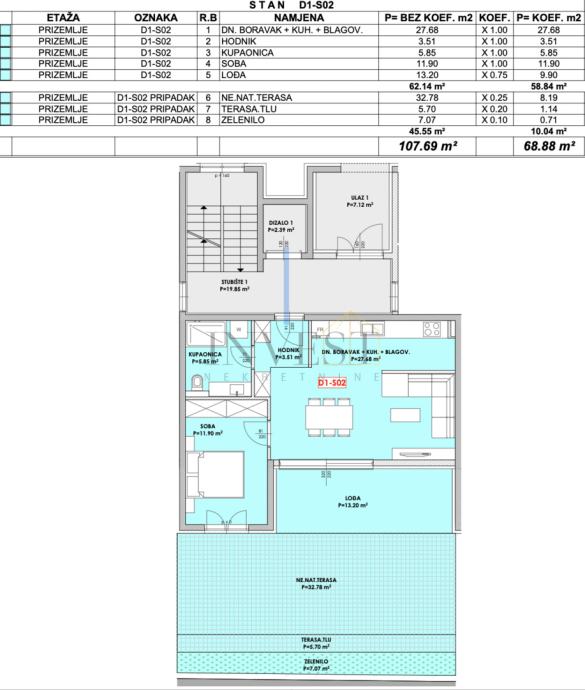 – Ukupna obračunska površina: 68.88 m²