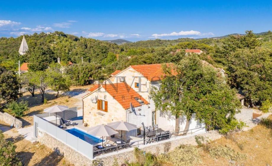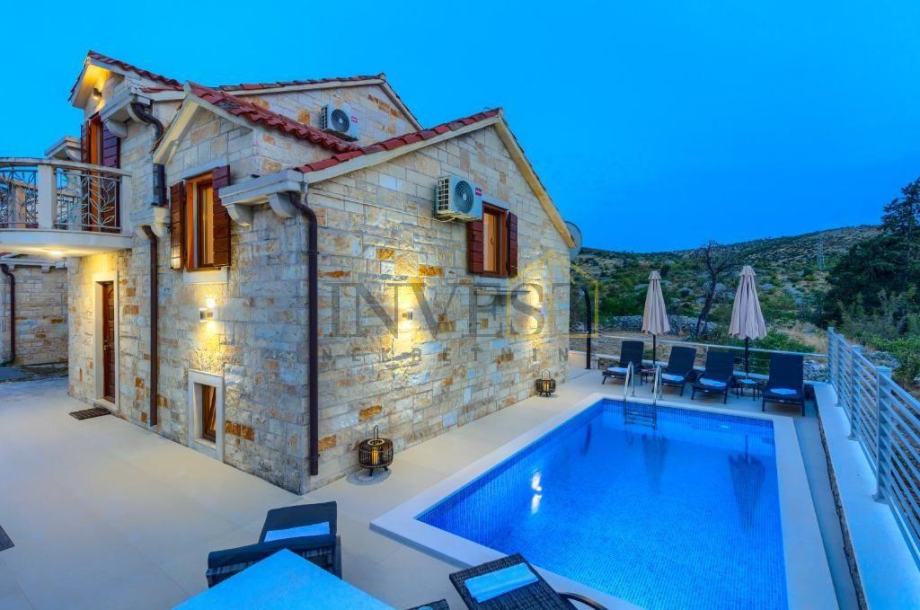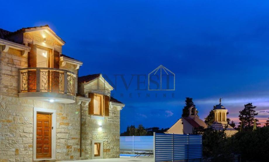 Stambena površina je 100 m2, dok je površina okućnice također 100m2. U podrumu se nalazi konoba, dok je u prizemlju smješten dnevni boravak sa kuhinjom i blagovaonicom, kupaonica i spavaća soba. Unutarnje stepenice vode na kat na kojem su smještene jos 2 spavaće sobe i kupaonica. Sa balkona se prostire pogled na more i okolicu. Ispred kuće smješten je bazen veličine 20m2, te prostor za uživanje na otvorenom namijenjen zajedničkom druženju.