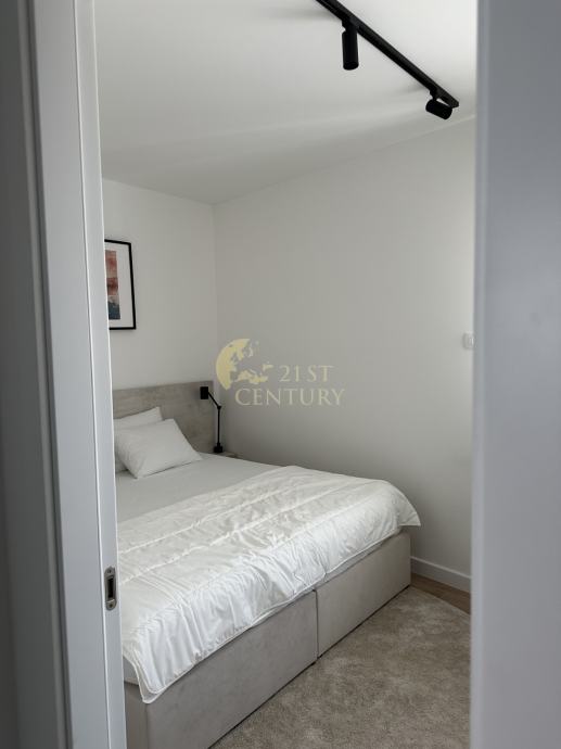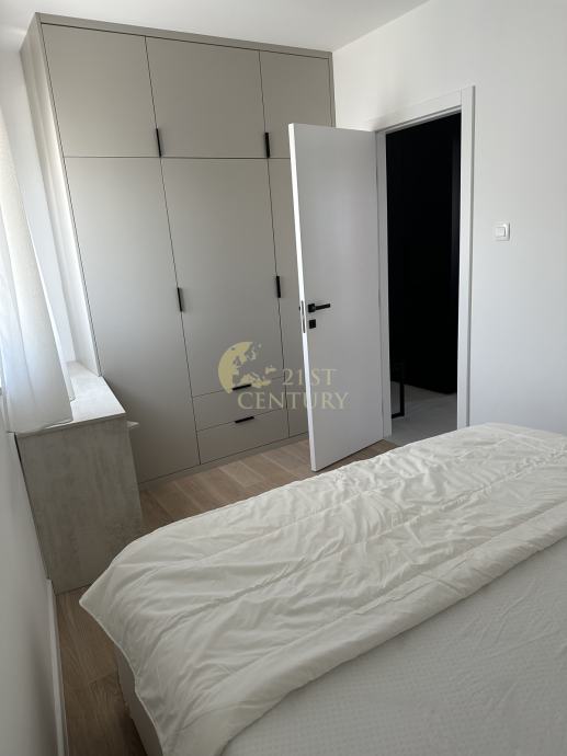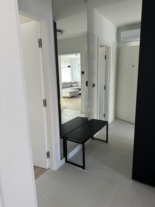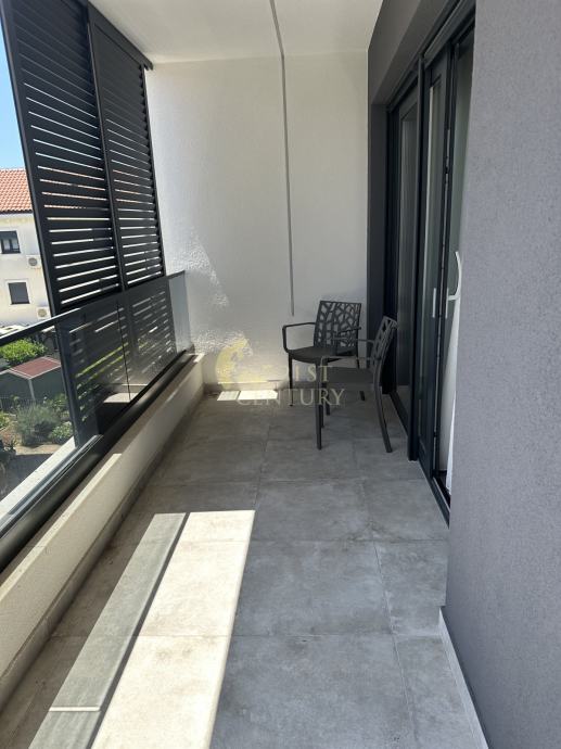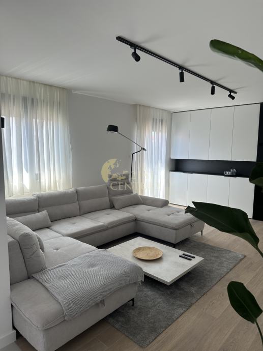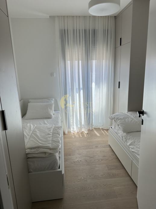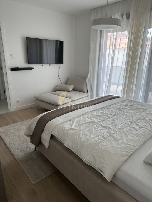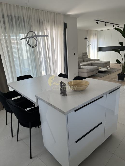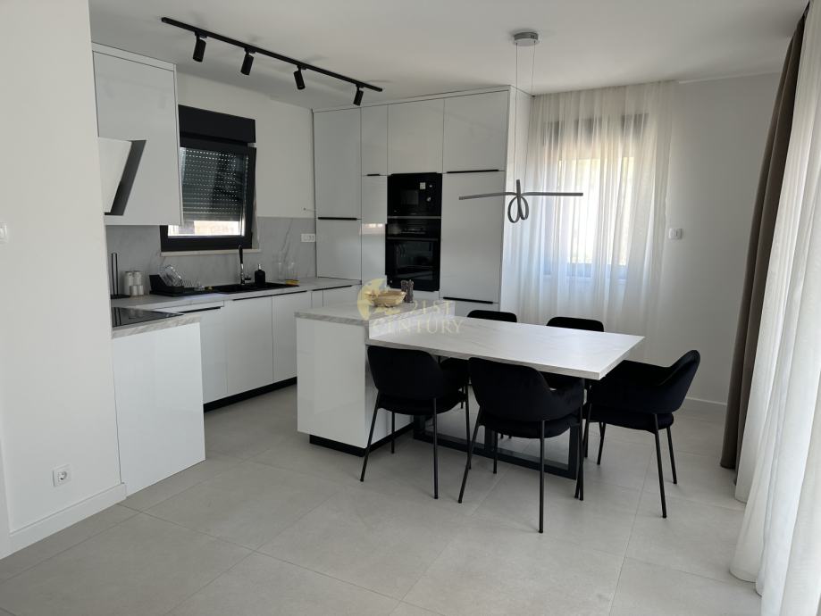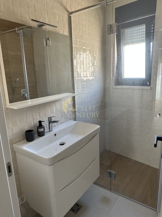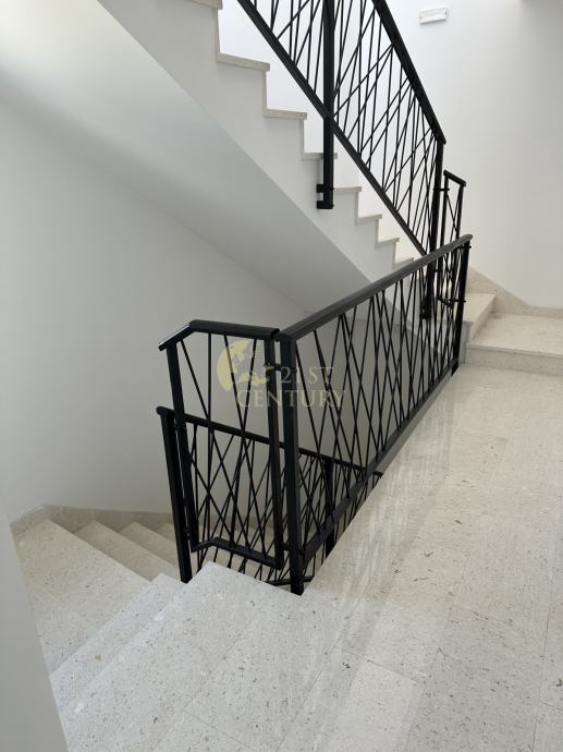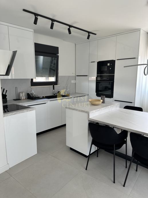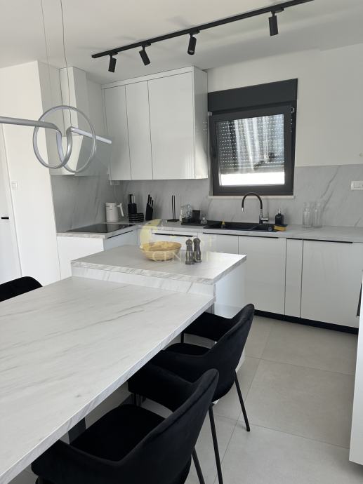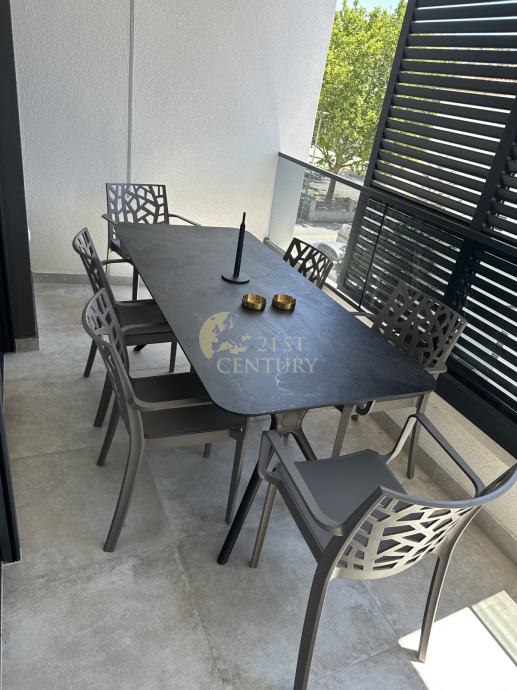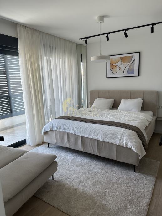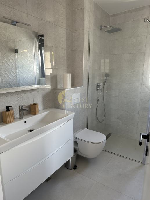 We mediate the rental of a luxurious three-room apartment in Steožanac. It is located in a quiet and intimate location in an urban villa on the 2nd floor. It consists of a spacious living room with a kitchen and a dining room with access to the balcony, one bedroom with two separate beds for children, a second bedroom with a double bed, a third spacious double room with its own bathroom and access to the balcony, a storage room, a bathroom and a separate toilet . The apartment also has a roof terrace of 105 m2 with a mini kitchen, a pergola under which there is a summer set, a jacuzzi, a solar shower, deckchairs for sunbathing and enjoyment. The building is a new construction and this is the first move-in.
