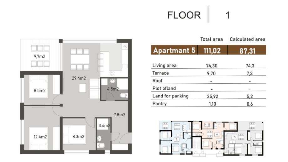 Stan 5 smješten je na prvom katu, a njegova ukupna površina iznosi 111,02 m², s obračunskom površinom od 87,31 m², ovaj stan ima tri prostrane spavaće sobe, što ga čini idealnim izborom za obitelji ili one koji traže dodatni prostor i udobnost.