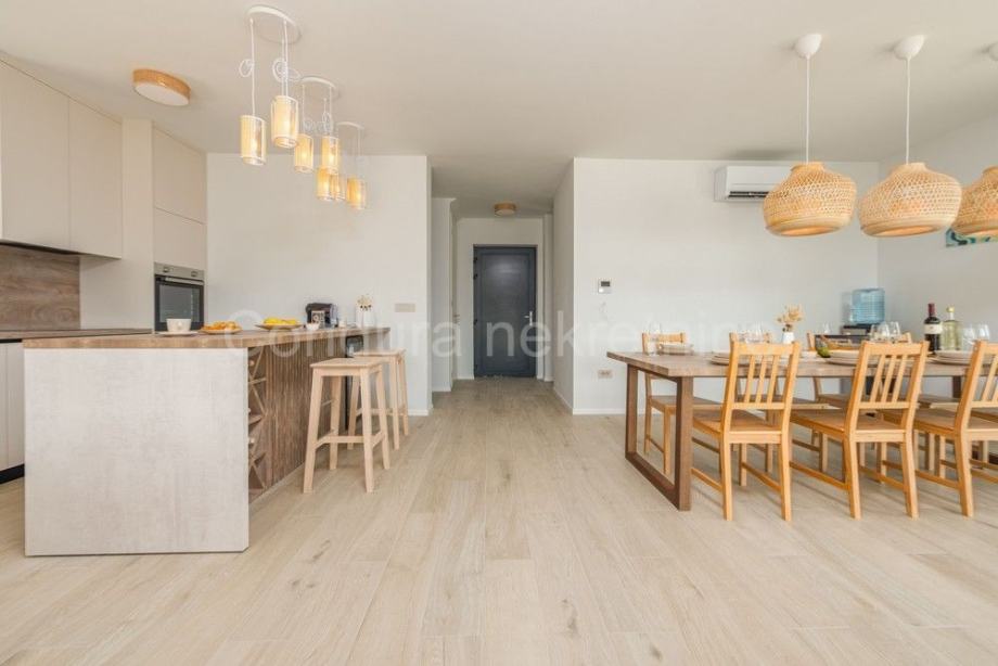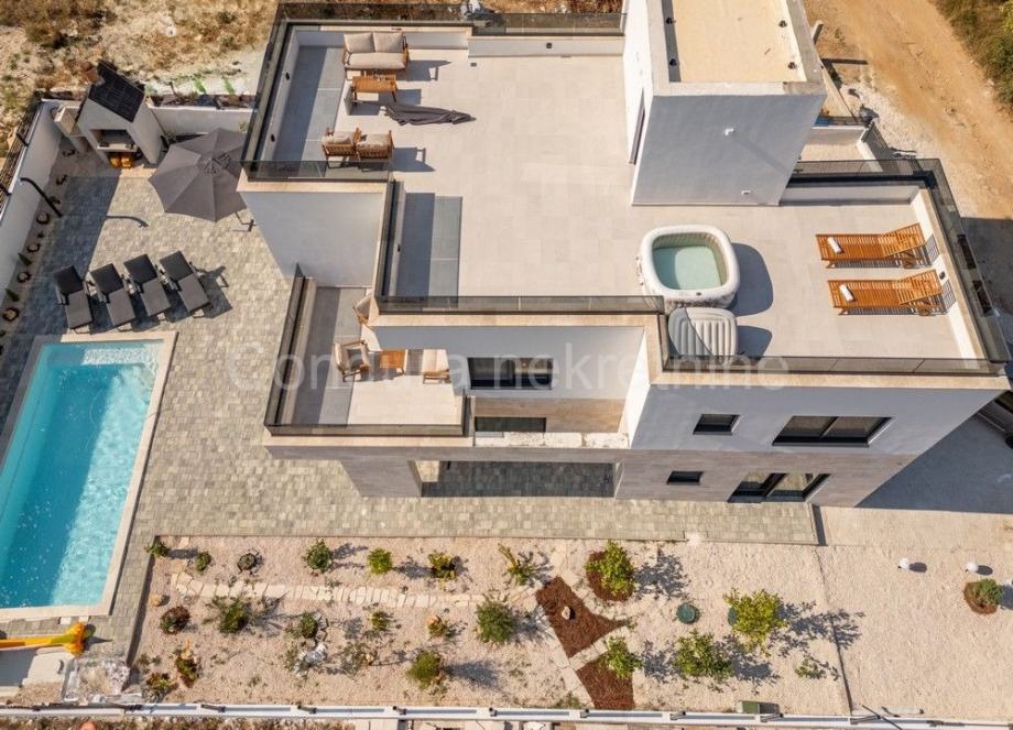 Krovna terasa posjeduje očaravajući pogled na okolicu, bazen i okućnicu uređenu s mediteranskim biljem i raslinjem s ugrađenim navodnjavanjem vode.