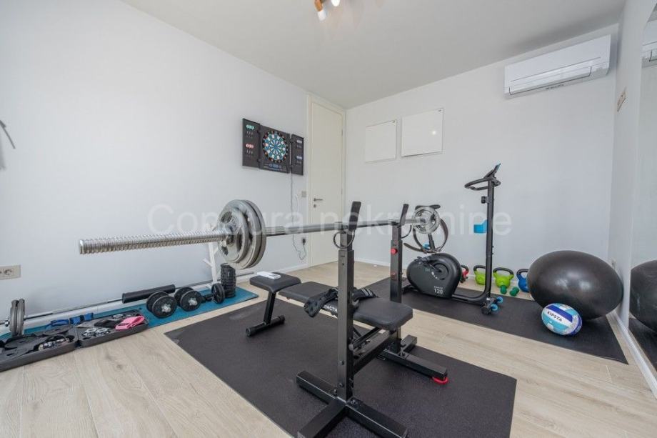 U prizemlju se nalazi kuhinja , prostrani dnevni boravak okružen velikim staklenim stijenama s kojih se pruža pogled na bazen i vanjsku terasu, blagavaonica, kupaonica i opremljena fitness dvorana.