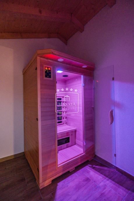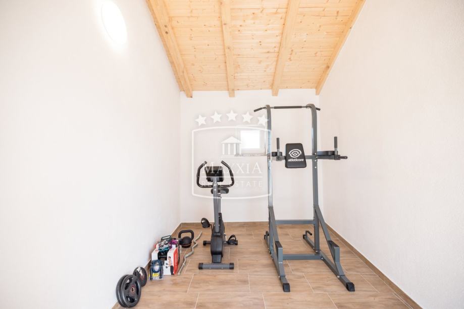 Sastoji se od prizemlja i kata koji su povezani unutarnjim stepeništem te velike okućnice s bazenom od 32m2 i pomoćnim objektom od 44m2.