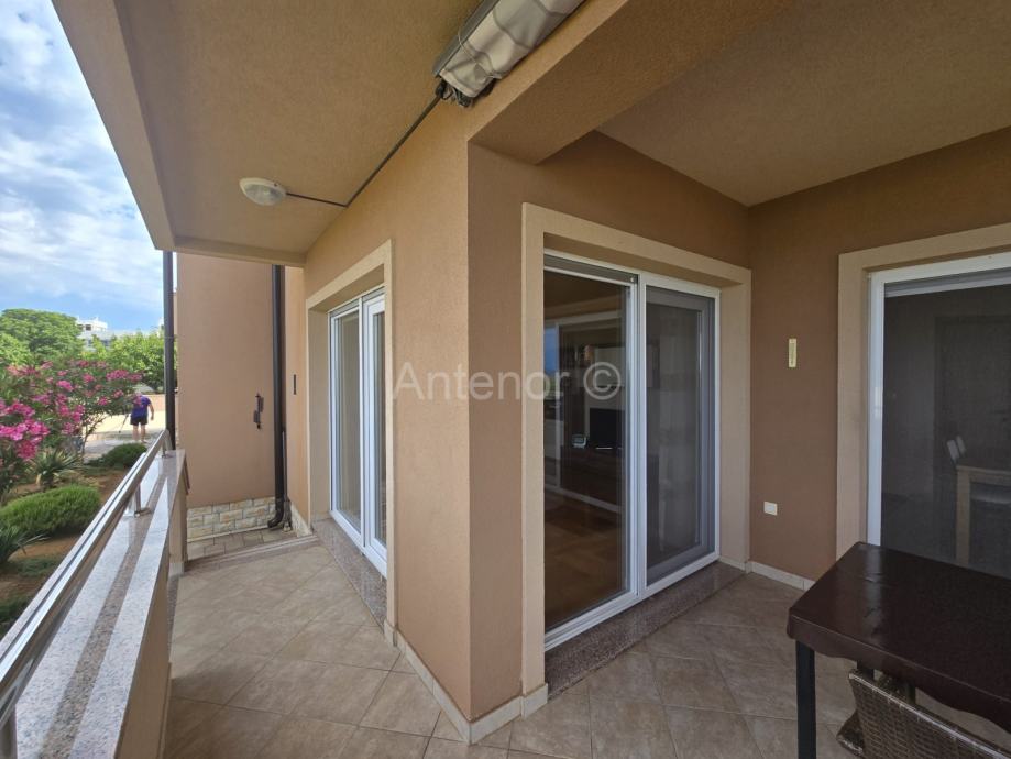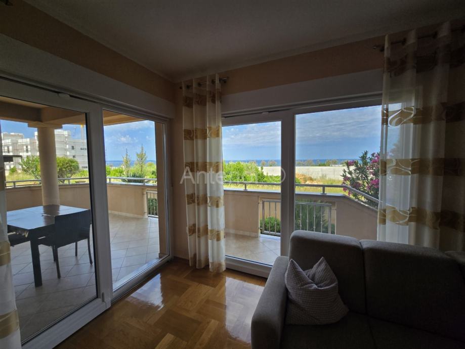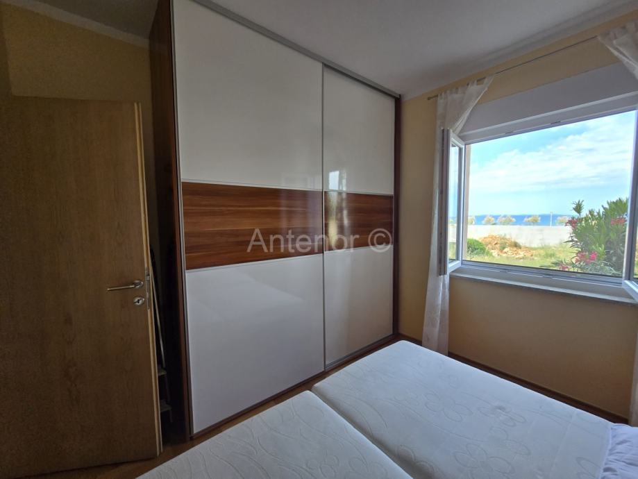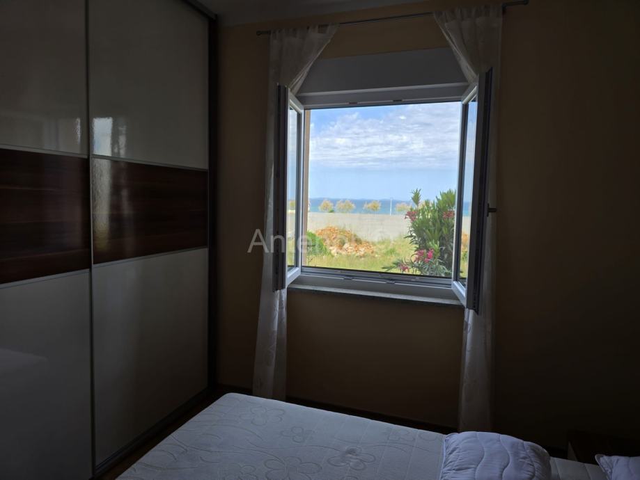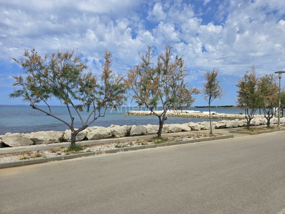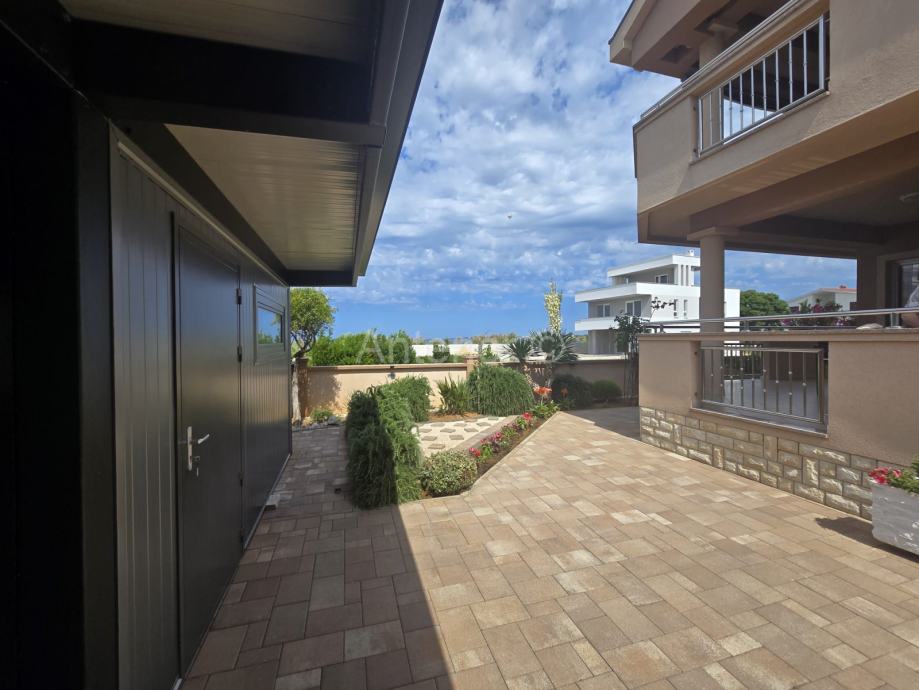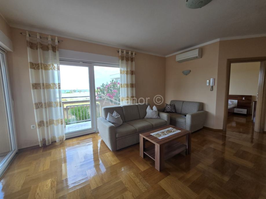 NIN-ZATON - prodaje se apartaman koji se sastoji od spremišta, kupaonice, dvije spavaće sobe, kuhinje, blagavaonice, dnevnog boravka, lođe i natkrivene terase ukupne korisne površine 92,10 m2. Apartmanu pripada i vrt korisne površine 44,60 m2. Apartman se nalazi u manjoj stambenoj zgradi od ukupno 4 stambene jedinice, a udaljenost od mora i plaže je 200 m. Vlasništvo uredno bez tereta.